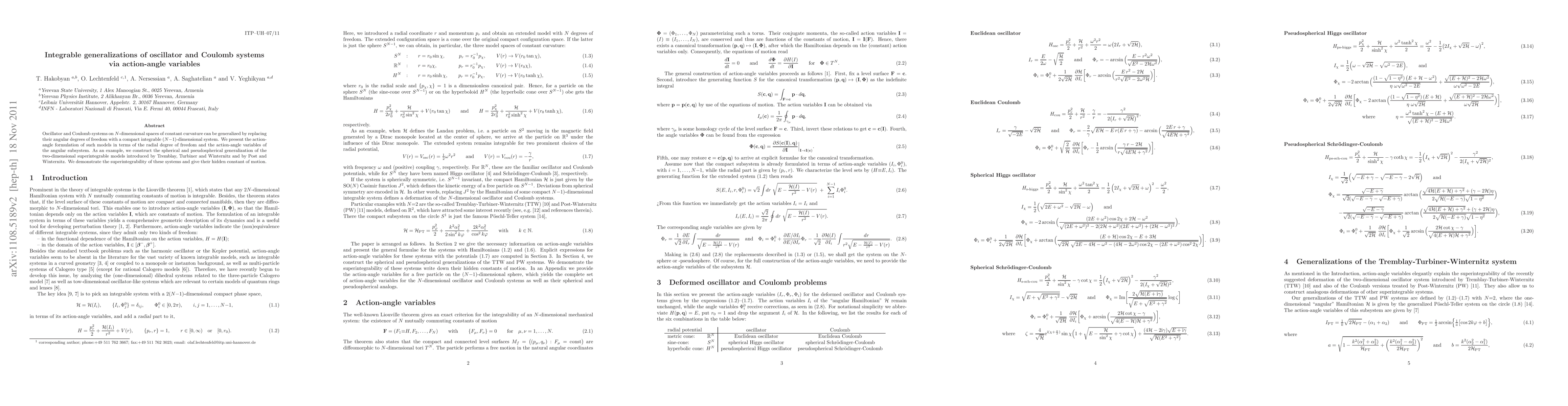 This paper generalizes oscillator and Coulomb systems in N-dimensional spaces by integrating a compact, superintegrable (N-1)-dimensional system for angular degrees. It presents an action-angle formulation and demonstrates the superintegrability of the spherical and pseudospherical versions, providing a hidden constant of motion.