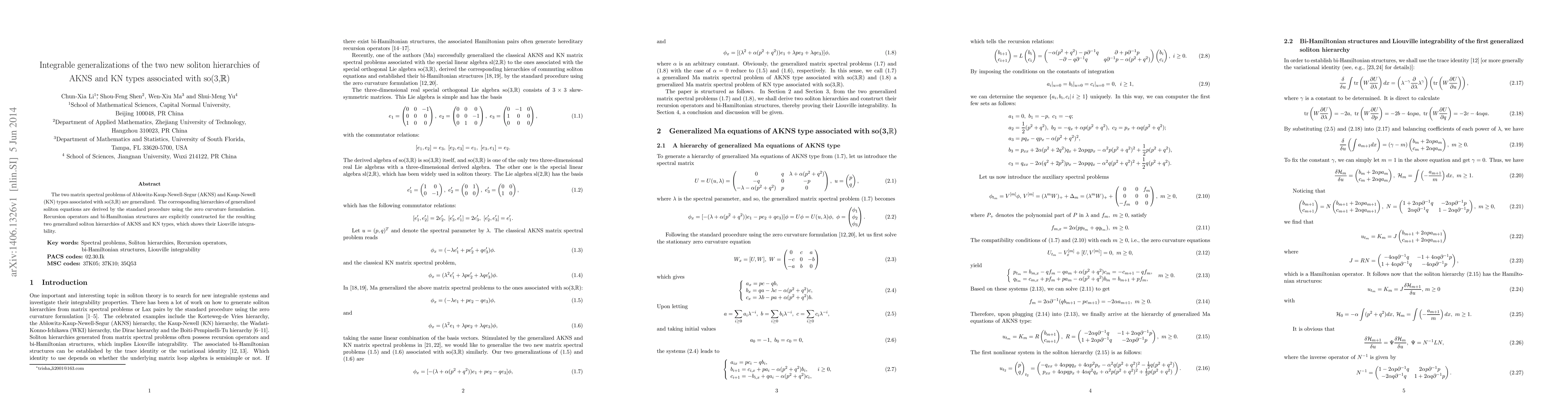 This paper generalizes the matrix spectral problems of AKNS and KN types linked to $so(3,\mathbb{R})$, deriving corresponding soliton hierarchies. It constructs recursion operators and bi-Hamiltonian structures, demonstrating the Liouville integrability of the generalized soliton hierarchies.