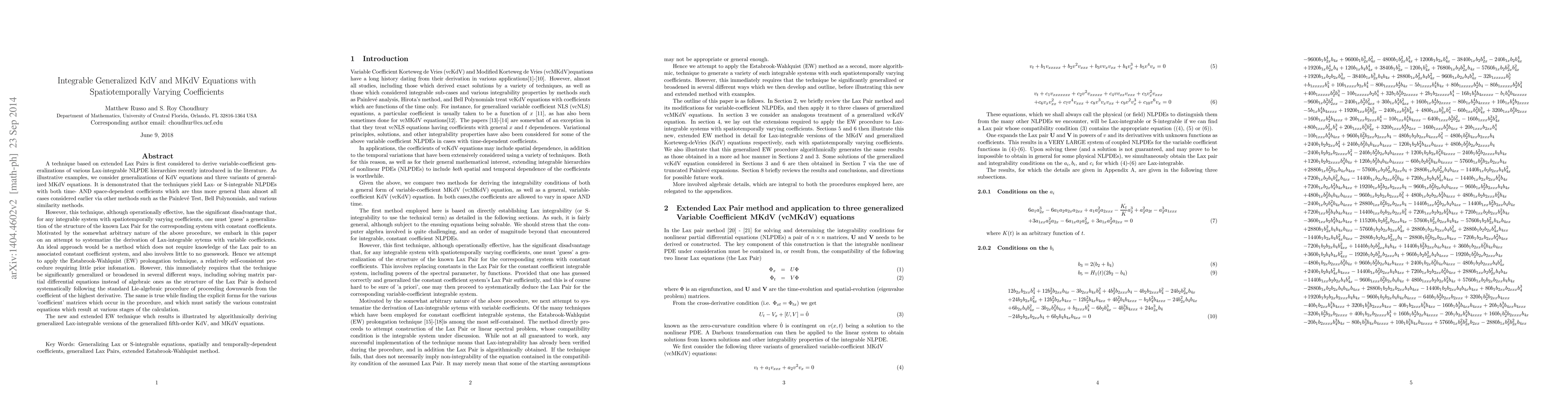 A technique based on extended Lax Pairs is first considered to derive variable-coefficient generalizations of various Lax-integrable NLPDE hierarchies recently introduced in the literature. As illustrative examples, we consider generalizations of KdV equations and three variants of generalized MKdV equations. It is demonstrated that the techniques yield Lax- or S-integrable NLPDEs with both time- AND space-dependent coefficients which are thus more general than almost all cases considered earlier via other methods such as the Painleve Test, Bell Polynomials, and various similarity methods. However, this technique, although operationally effective, has the significant disadvantage that, for any integrable system with spatiotemporally varying coefficients, one must guess a generalization of the structure of the known Lax Pair for the corresponding system with constant coefficients. Motivated by the somewhat arbitrary nature of the above procedure, we embark in this paper on an attempt to systematize the derivation of Lax-integrable sytems with variable coefficients. Hence we attempt to apply the Estabrook-Wahlquist (EW) prolongation technique, a relatively self-consistent procedure requiring little prior information. However, this immediately requires that the technique be significantly generalized or broadened in several different ways, including solving matrix partial differential equations instead of algebraic ones. The new and extended EW technique whch results is illustrated by algorithmically deriving generalized Lax-integrable versions of the generalized fifth-order KdV, and MKdV equations.