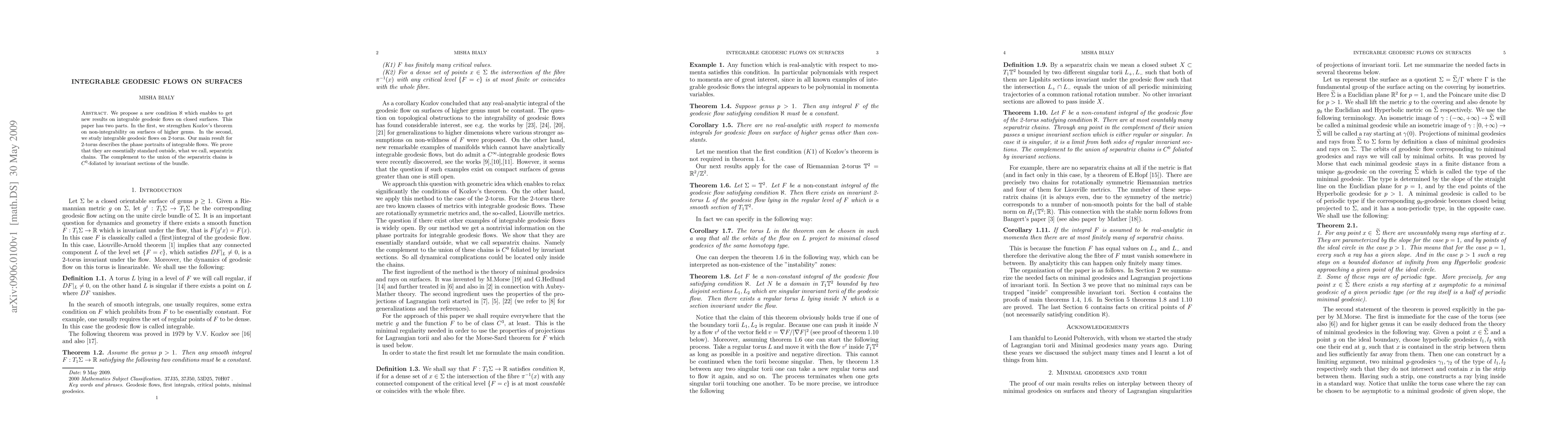 This paper introduces a new condition $\aleph$ to enhance results on integrable geodesic flows on closed surfaces. It strengthens Kozlov's theorem on non-integrability for higher genus surfaces and studies integrable flows on the 2-torus, proving that their phase portraits are standard except for separatrix chains, with invariant sections foliating the complement.