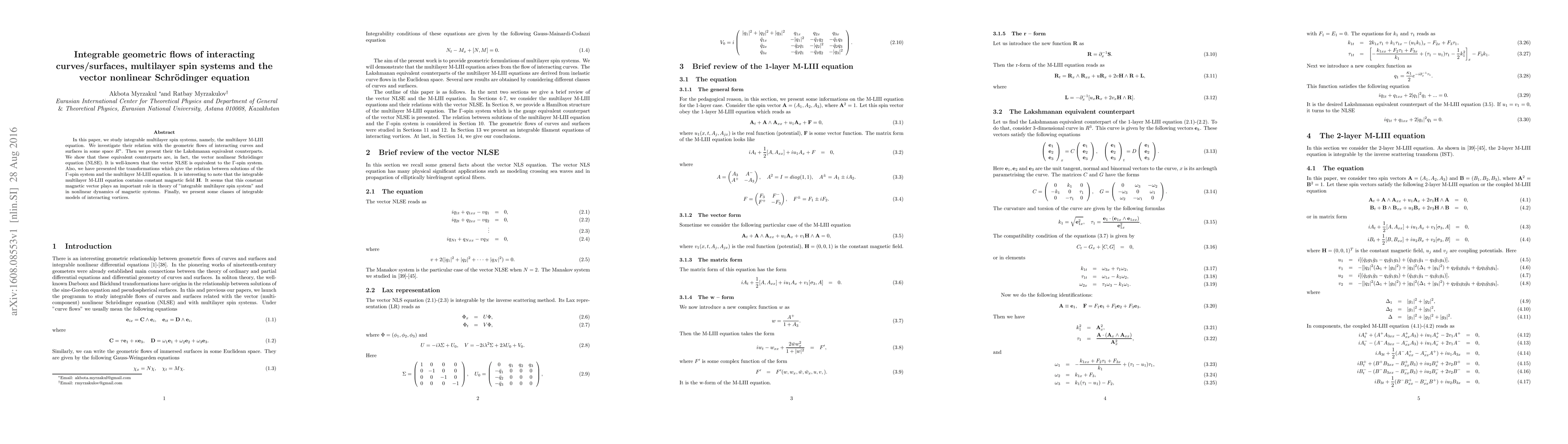 In this paper, we study integrable multilayer spin systems, namely, the multilayer M-LIII equation. We investigate their relation with the geometric flows of interacting curves and surfaces in some space $R^{n}$. Then we present their the Lakshmanan equivalent counterparts. We show that these equivalent counterparts are, in fact, the vector nonlinear Schr\"odinger equation (NLSE). It is well-known that the vector NLSE is equivalent to the $\Gamma$-spin system. Also, we have presented the transformations which give the relation between solutions of the $\Gamma$-spin system and the multilayer M-LIII equation. It is interesting to note that the integrable multilayer M-LIII equation contains constant magnetic field ${\bf H}$. It seems that this constant magnetic vector plays an important role in theory of "integrable multilayer spin system" and in nonlinear dynamics of magnetic systems. Finally, we present some classes of integrable models of interacting vortices.