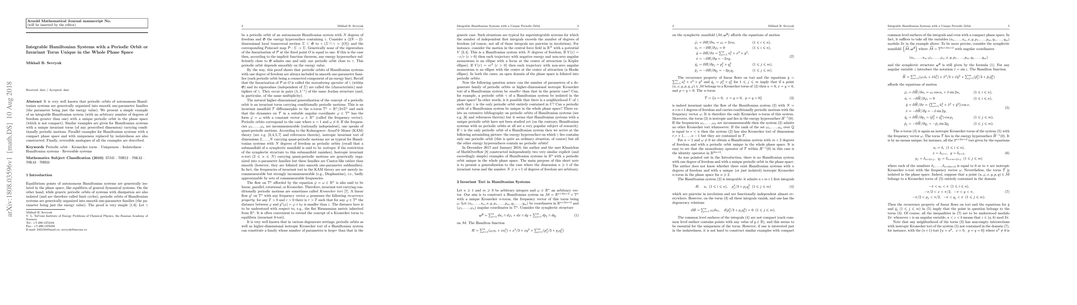 This paper presents examples of integrable Hamiltonian systems with a unique periodic orbit or invariant torus in their phase space, contrasting with the usual organization of periodic orbits into families. It also constructs reversible analogues of such systems.