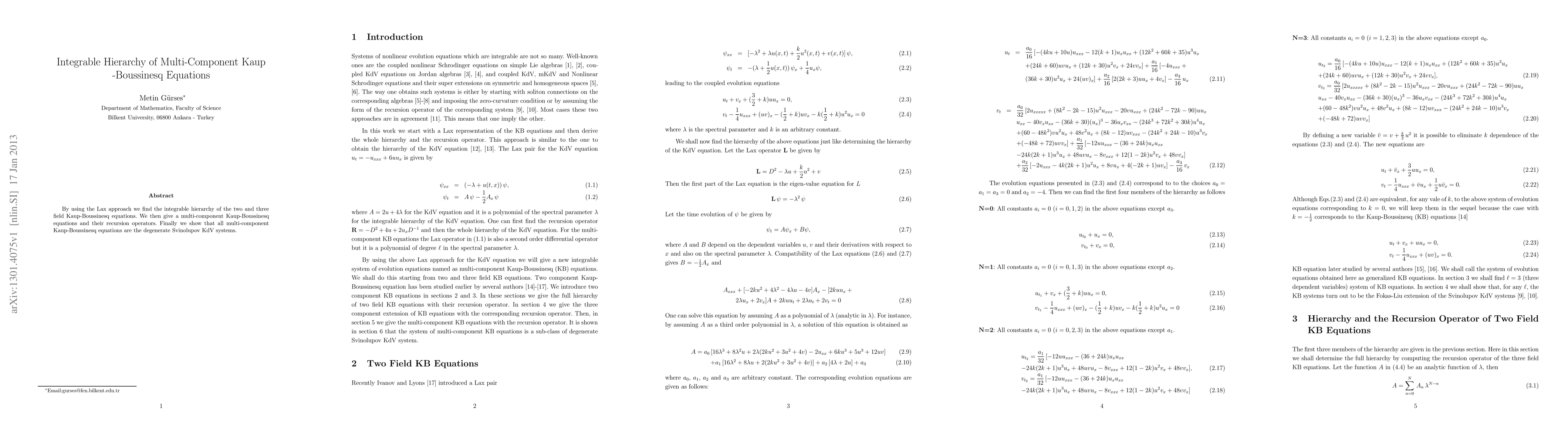 This paper utilizes the Lax approach to derive an integrable hierarchy for the two and three field Kaup-Boussinesq equations, presenting multi-component versions and their recursion operators, ultimately showing they are degenerate forms of the Svinolupov KdV systems.