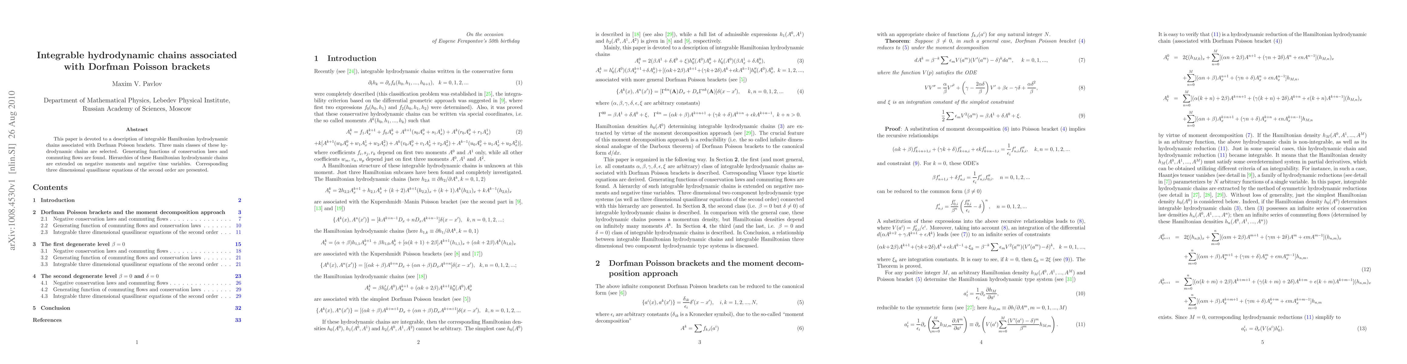This paper explores integrable hydrodynamic chains linked to Dorfman Poisson brackets, identifying three main classes, deriving their conservation laws, and extending their hierarchies to negative moments and time variables, ultimately presenting corresponding three-dimensional quasilinear equations.