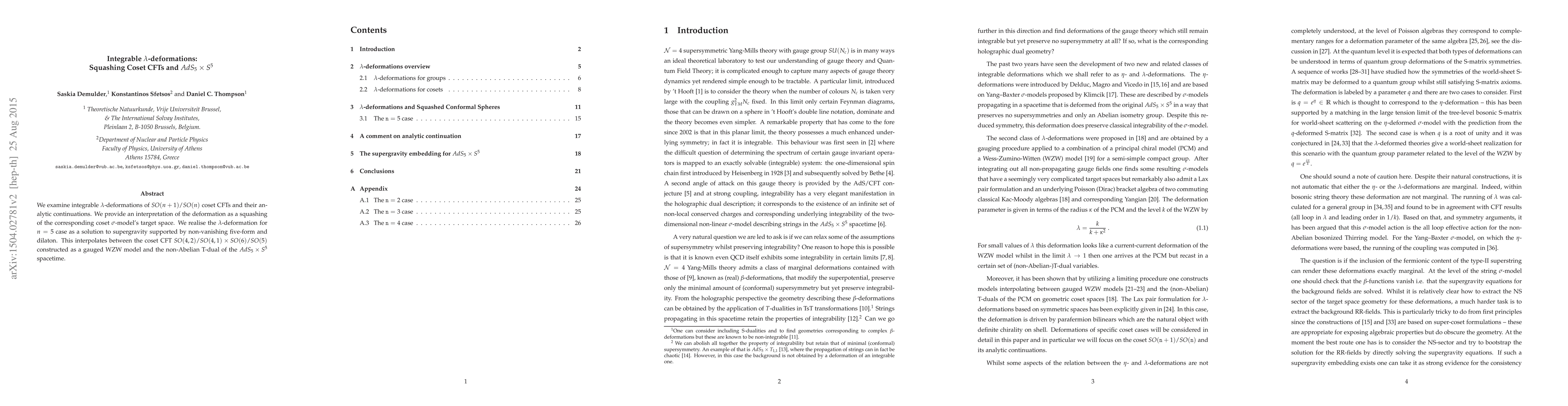 This paper explores integrable $\lambda$-deformations of $SO(n+1)/SO(n)$ coset conformal field theories, interpreting the deformation as a squashing of the coset $\sigma$-model's target space. For $n=5$, it realizes the deformation as a supergravity solution, interpolating between $AdS_5\times S^5$ and a gauged WZW model.