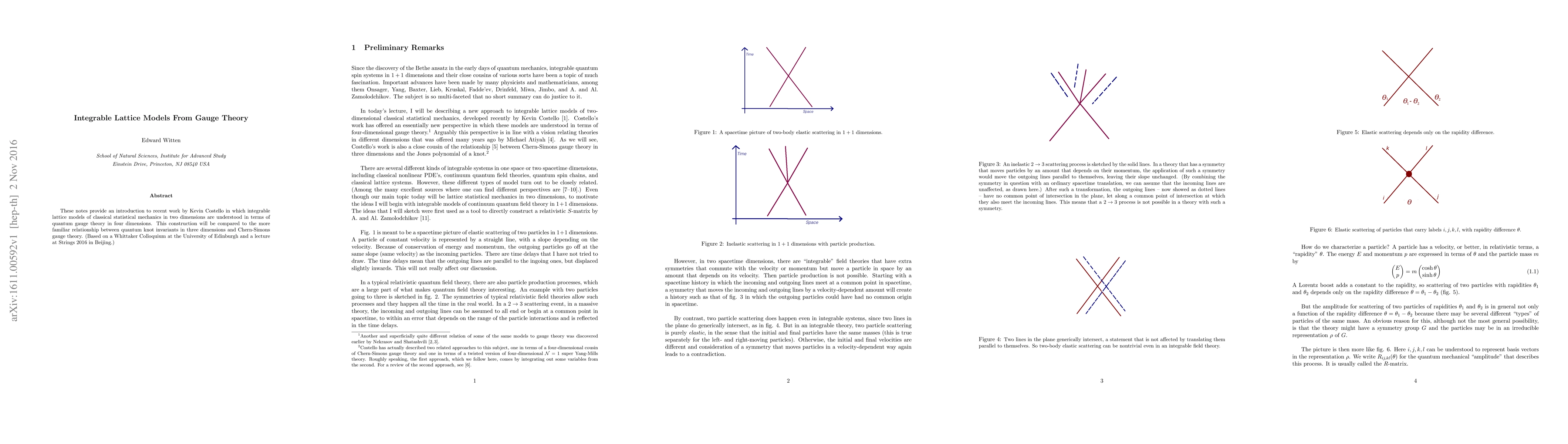 This paper introduces Kevin Costello's work linking integrable lattice models of classical statistical mechanics to quantum gauge theory in four dimensions, drawing parallels with the relationship between quantum knot invariants and Chern-Simons gauge theory. The findings were presented at the Whittaker Colloquium and the Strings 2016 conference.