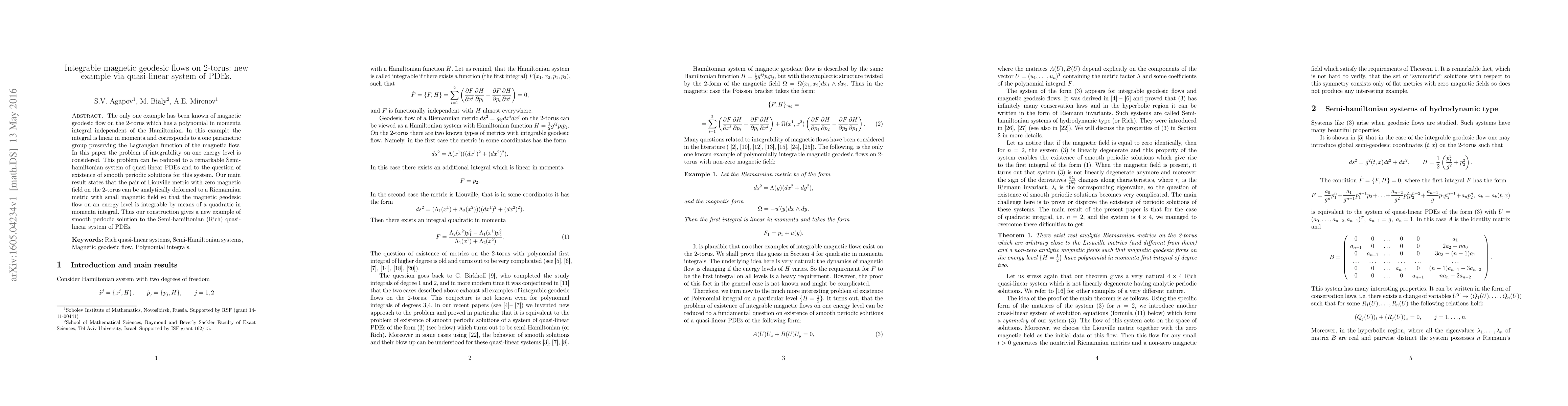 The only one example has been known of magnetic geodesic flow on the 2-torus which has a polynomial in momenta integral independent of the Hamiltonian. In this example the integral is linear in momenta and corresponds to a one parametric group preserving the Lagrangian function of the magnetic flow. In this paper the problem of integrability on one energy level is considered. This problem can be reduced to a remarkable Semi-hamiltonian system of quasi-linear PDEs and to the question of existence of smooth periodic solutions for this system. Our main result states that the pair of Liouville metric with zero magnetic field on the 2-torus can be analytically deformed to a Riemannian metric with small magnetic field so that the magnetic geodesic flow on an energy level is integrable by means of a quadratic in momenta integral. Thus our construction gives a new example of smooth periodic solution to the Semi-hamiltonian (Rich) quasi-linear system of PDEs.