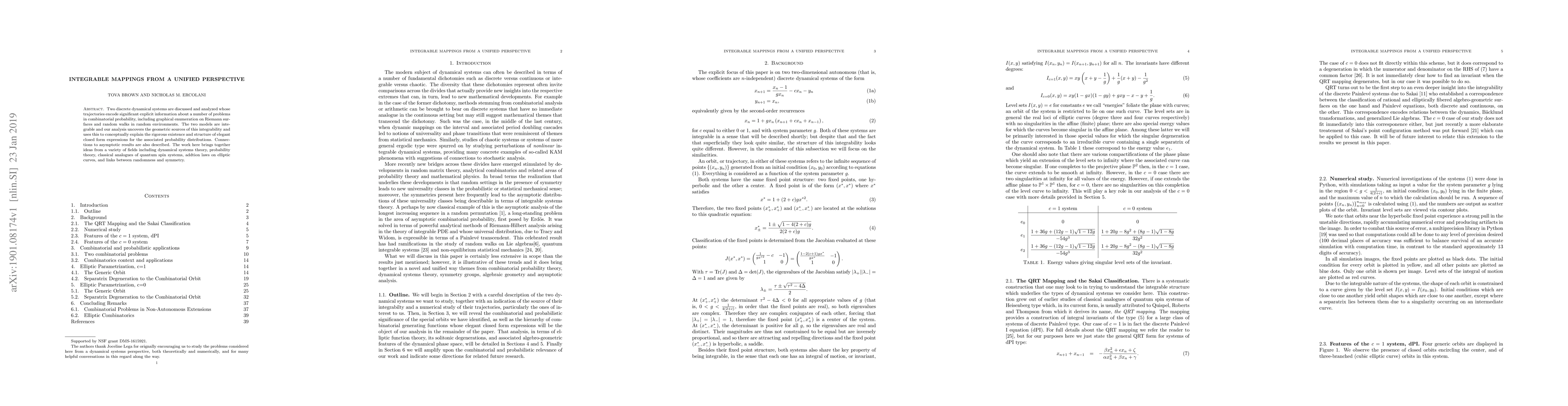 Two discrete dynamical systems are discussed and analyzed whose trajectories encode significant explicit information about a number of problems in combinatorial probability, including graphical enumeration on Riemann surfaces and random walks in random environments. The two models are integrable and our analysis uncovers the geometric sources of this integrability and uses this to conceptually explain the rigorous existence and structure of elegant closed form expressions for the associated probability distributions. Connections to asymptotic results are also described. The work here brings together ideas from a variety of fields including dynamical systems theory, probability theory, classical analogues of quantum spin systems, addtion laws on elliptic curves, and links between randomness and symmetry.