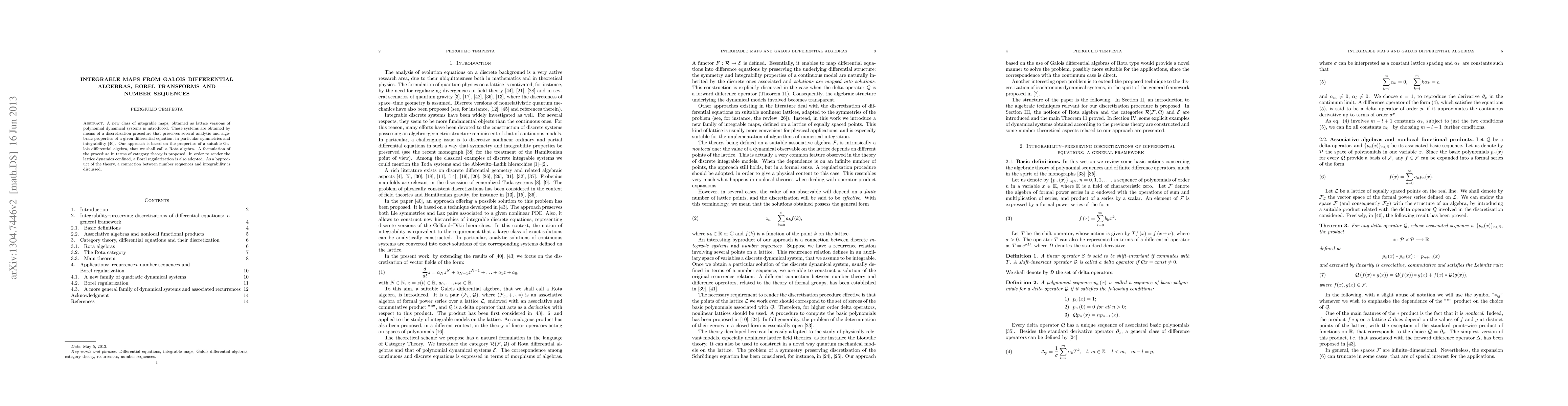 A new class of integrable maps, obtained as lattice versions of polynomial dynamical systems is introduced. These systems are obtained by means of a discretization procedure that preserves several analytic and algebraic properties of a given differential equation, in particular symmetries and integrability [40]. Our approach is based on the properties of a suitable Galois differential algebra, that we shall call a Rota algebra. A formulation of the procedure in terms of category theory is proposed. In order to render the lattice dynamics confined, a Borel regularization is also adopted. As a byproduct of the theory, a connection between number sequences and integrability is discussed.