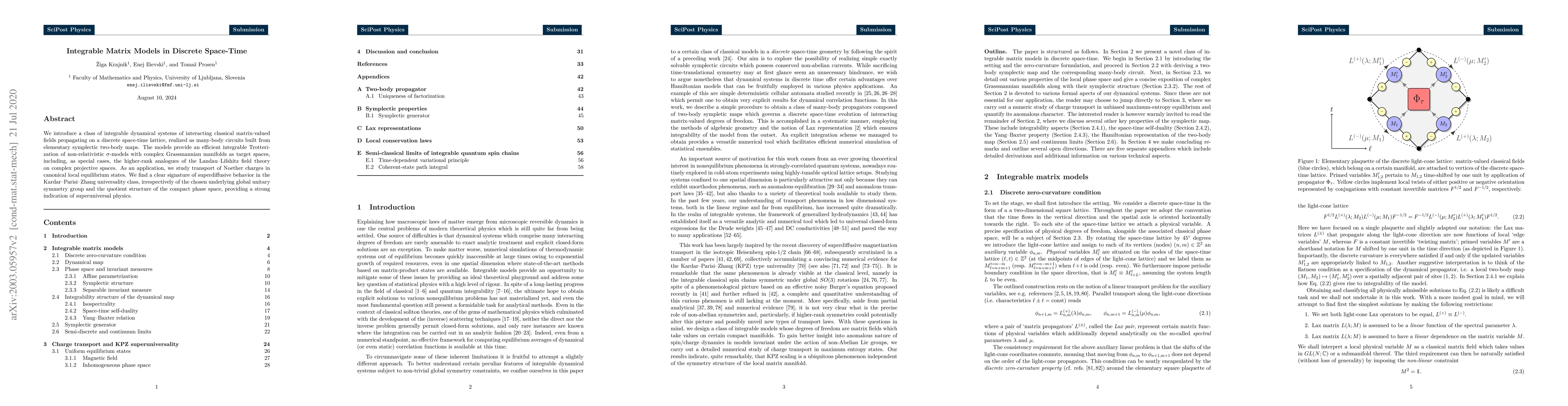 This paper presents a class of integrable matrix models on a discrete space-time lattice, offering an efficient integrable Trotterization of non-relativistic σ-models. It demonstrates superdiffusive transport of Noether charges in local equilibrium states, indicating superuniversal physics regardless of the global symmetry group.