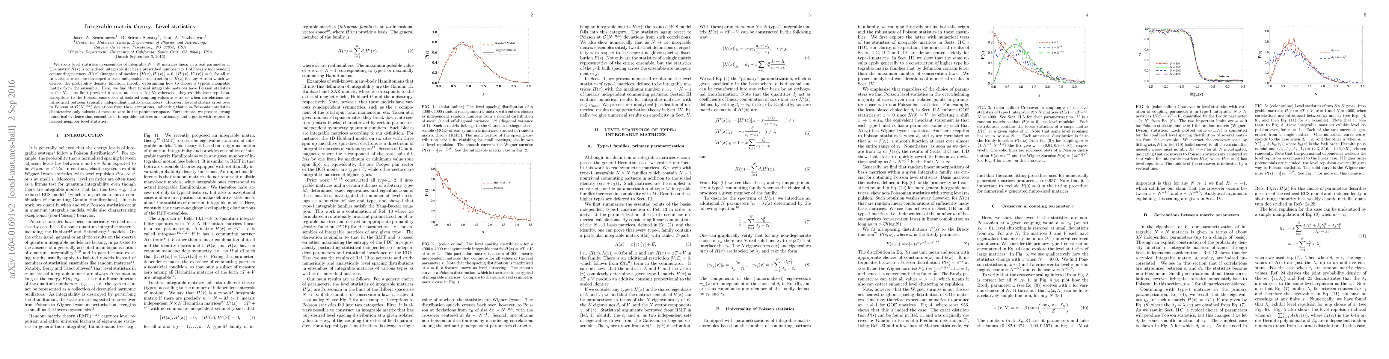 This paper investigates level statistics in ensembles of integrable matrices, showing that typical matrices exhibit Poisson statistics in the large $N$ limit when the number of commuting partners scales at least as $\log{N}$. Exceptions to this occur at specific coupling values or with introduced correlations, but these non-Poissonian behaviors are confined to measure zero subsets in parameter space.