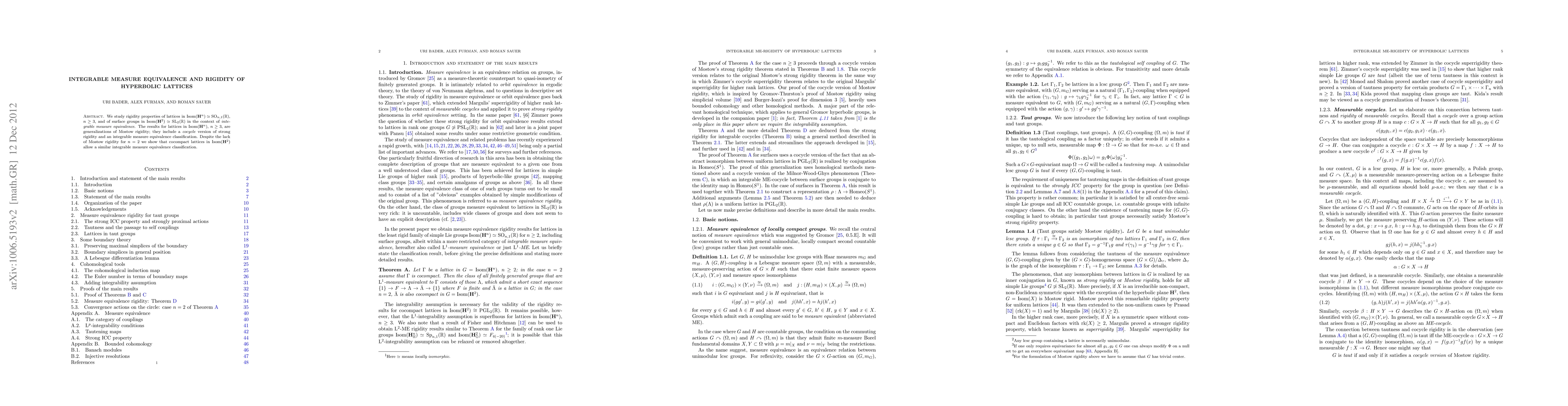 This paper investigates the rigidity properties of hyperbolic lattices in spaces with dimensions greater than two, extending Mostow rigidity. It also explores surface groups' integrable measure equivalence, providing a classification for cocompact lattices in SL(2,R), even where Mostow rigidity fails.