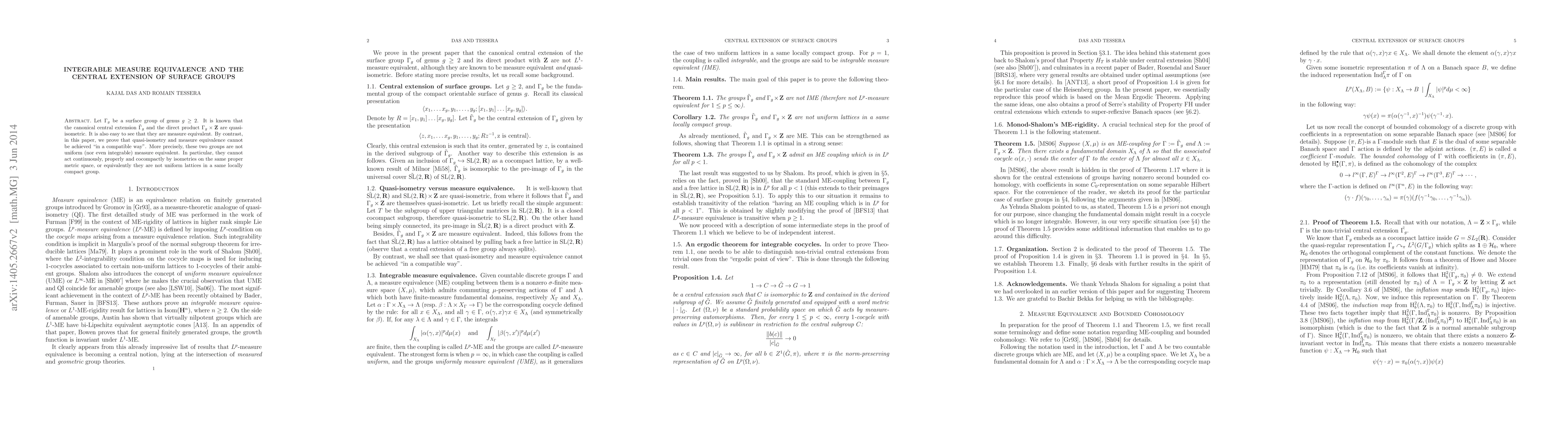 This paper investigates the measure equivalence of the central extension $\tilde{\Gamma}_g$ and the direct product $\Gamma_g \times \mathbb{Z}$ of surface groups, proving that despite their quasi-isometry, they are not uniformly or integrable measure equivalent. Thus, they cannot act as uniform lattices in a shared locally compact group.