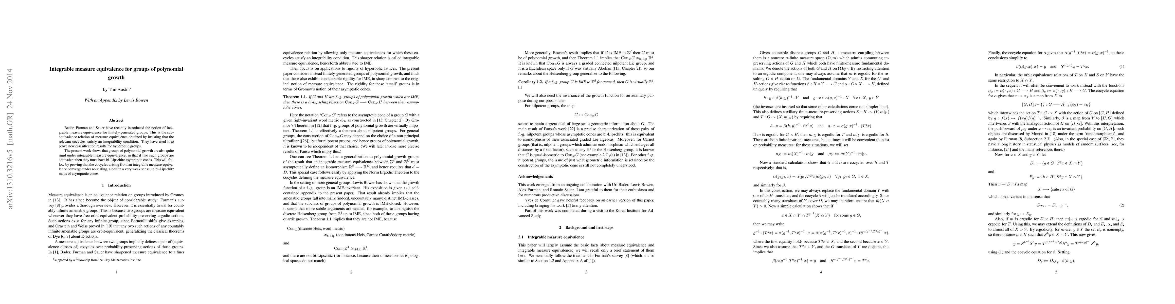 The paper demonstrates that groups of polynomial growth exhibit rigidity under integrable measure equivalence, showing that equivalent such groups must have bi-Lipschitz asymptotic cones, a result derived from the convergence of cocycles in a weak sense.
