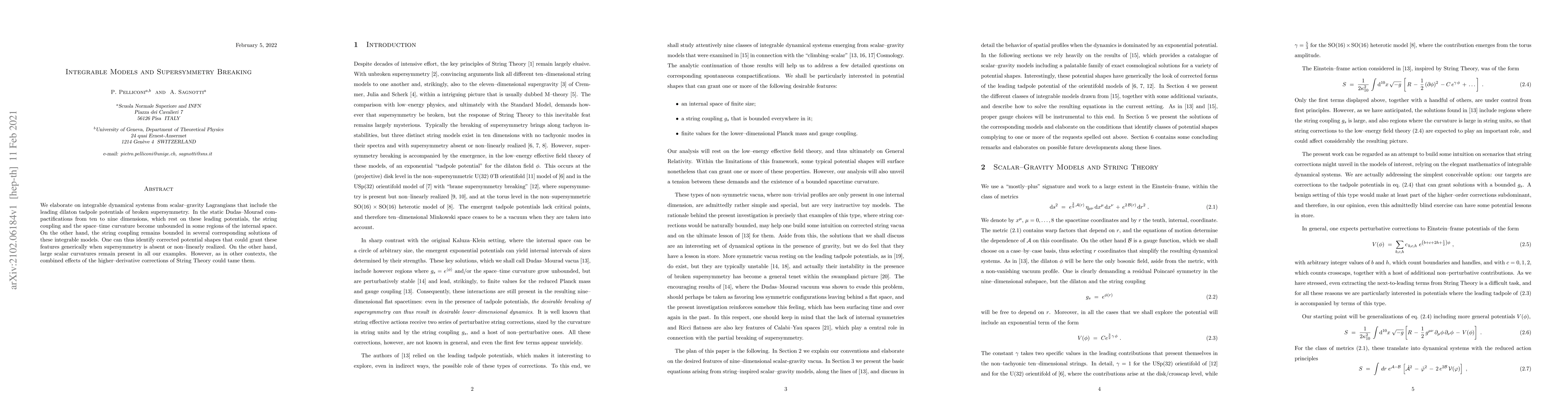 This paper explores integrable dynamical systems derived from scalar-gravity Lagrangians with broken supersymmetry, focusing on dilaton tadpole potentials. It finds that while string coupling and space-time curvature become unbounded in certain compactifications, integrable models provide bounded solutions, suggesting potential shapes that maintain these features without supersymmetry.