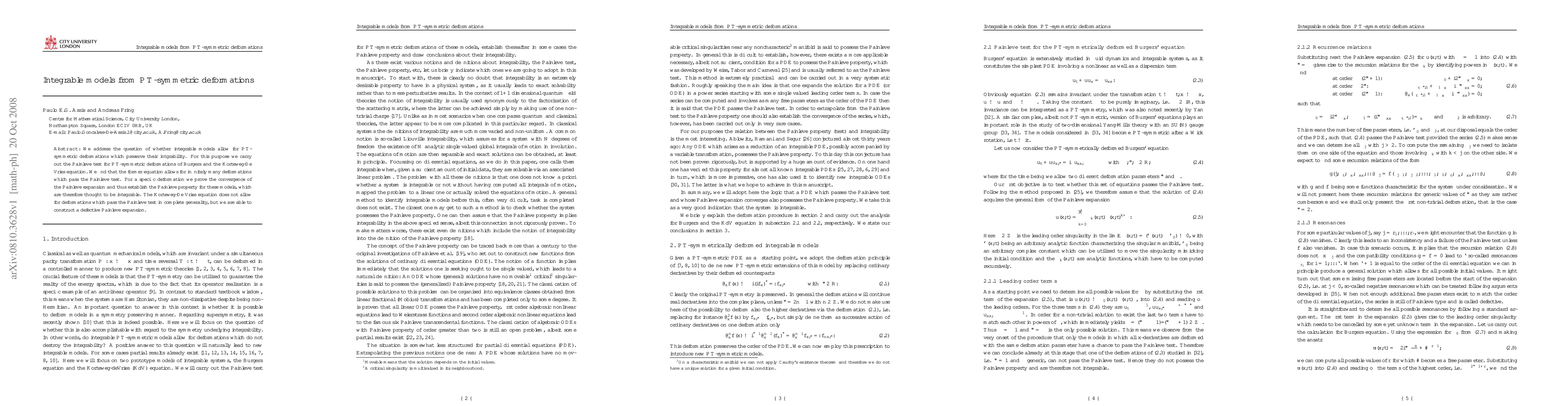 The research methodology involved applying the Painlevé test to PT-symmetric deformations of integrable models, specifically the Burgers' and Korteweg-de Vries equations, to determine if integrability is preserved.