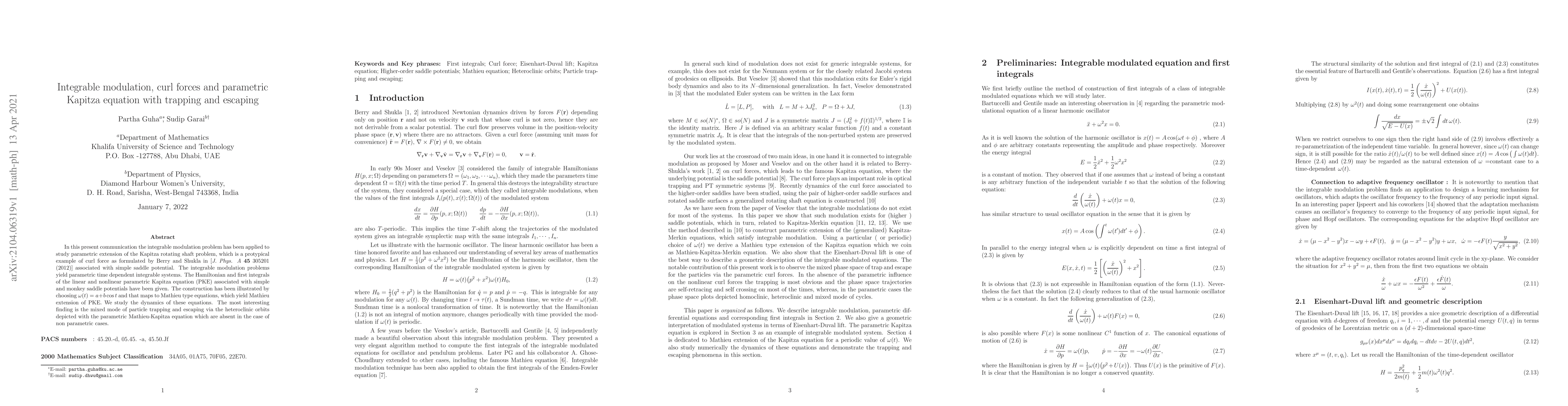 In this present communication the integrable modulation problem has been applied to study parametric extension of the Kapitza rotating shaft problem, which is a protypical example of curl force as formulated by Berry and Shukla in [J. Phys. A 45 305201 (2012)] associated with simple saddle potential. The integrable modulation problems yield parametric time dependent integrable systems. The Hamiltonian and first integrals of the linear and nonlinear parametric Kapitza equation (PKE) associated with simple and monkey saddle potentials have been given. The construction has been illustrated by choosing $\omega(t) = a + b \cos t$ and that maps to Mathieu type equations, which yield Mathieu extension of PKE. We study the dynamics of these equations. The most interesting finding is the mixed mode of particle trapping and escaping via the heteroclinic orbits depicted with the parametric Mathieu-Kapitza equation which are absent in the case of non parametric cases.