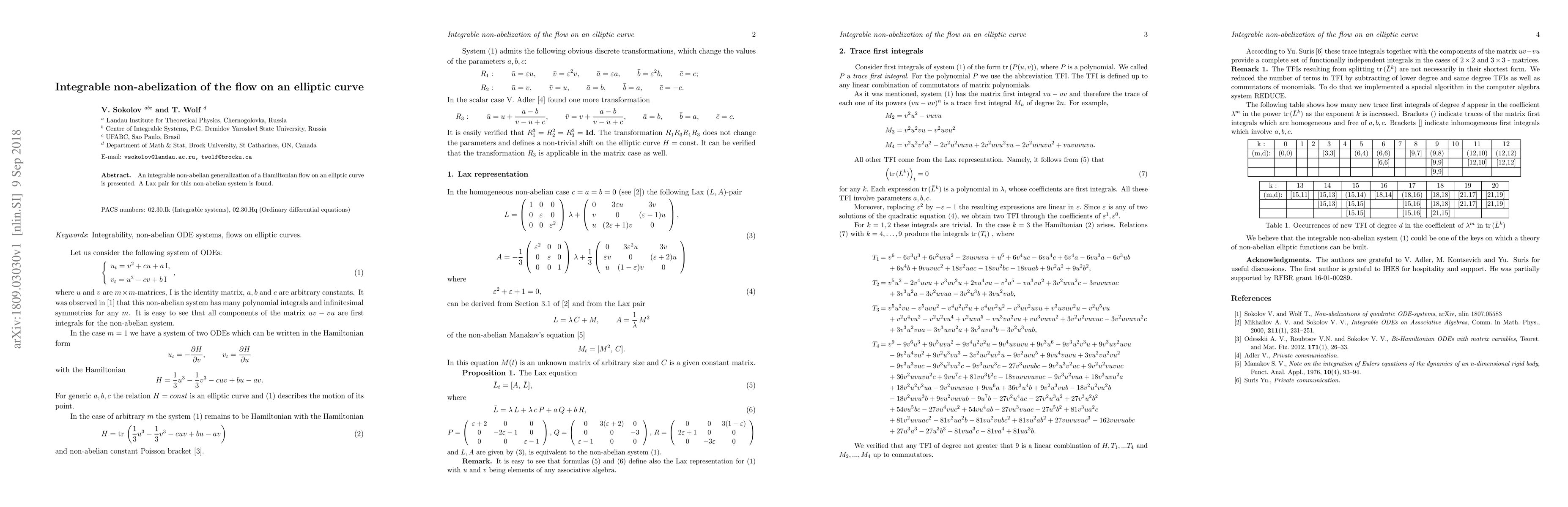 Summary: This paper introduces an integrable non-abelian extension of Hamiltonian flow on an elliptic curve and identifies a Lax pair for this generalized system, providing a framework for its analysis.