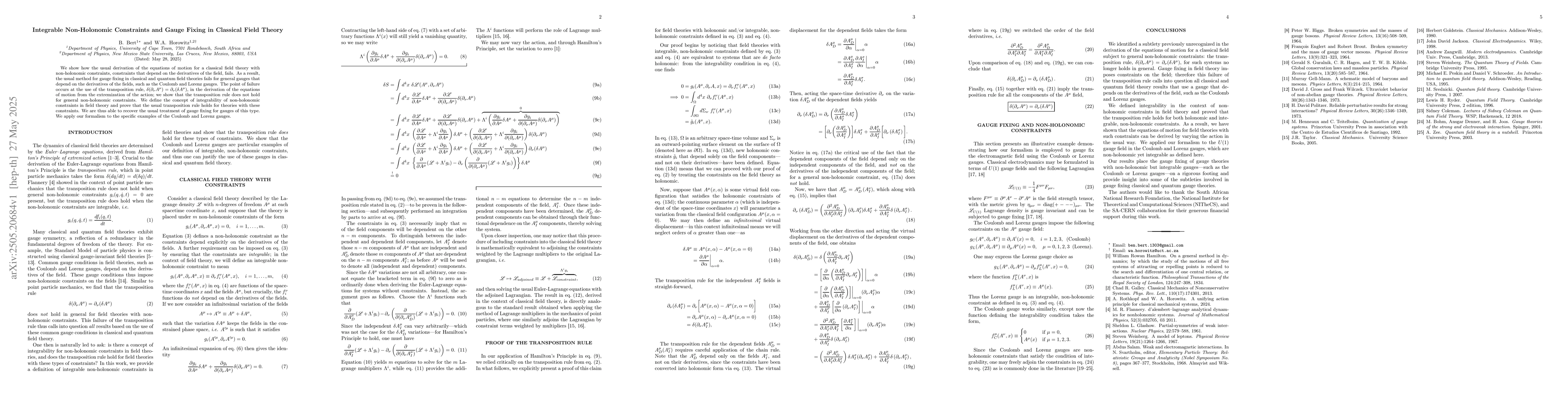 The paper presents a detailed analysis of non-holonomic constraints in classical field theory, identifying where the usual derivation of equations of motion fails due to the transposition rule not holding. It introduces the concept of integrability for non-holonomic constraints and proves that the transposition rule is valid under these conditions, allowing for the recovery of standard gauge-fixing methods.