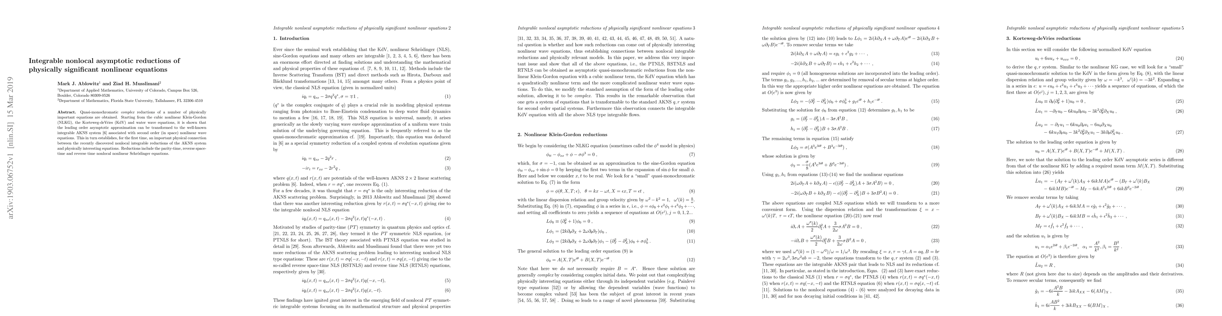 Quasi-monochromatic complex reductions of a number of physically important equations are obtained. Starting from the cubic nonlinear Klein-Gordon (NLKG), the Korteweg-deVries (KdV) and water wave equations, it is shown that the leading order asymptotic approximation can be transformed to the well-known integrable AKNS system [6] associated with second order (in space) nonlinear wave equations. This in turn establishes, for the first time, an important physical connection between the recently discovered nonlocal integrable reductions of the AKNS system and physically interesting equations. Reductions include the parity-time, reverse space-time and reverse time nonlocal nonlinear Schrodinger equations.