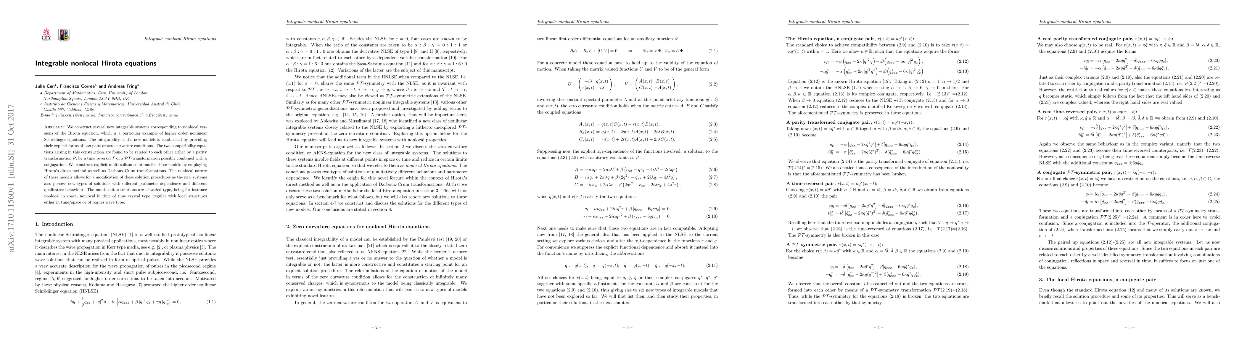This paper constructs new integrable nonlocal versions of the Hirota equation, establishing their integrability through Lax pairs and zero curvature conditions. The study reveals diverse multi-soliton solutions, including nonlocal in space/time, time crystal, and rogue wave types, showcasing unique solution procedures due to the nonlocal nature of the models.