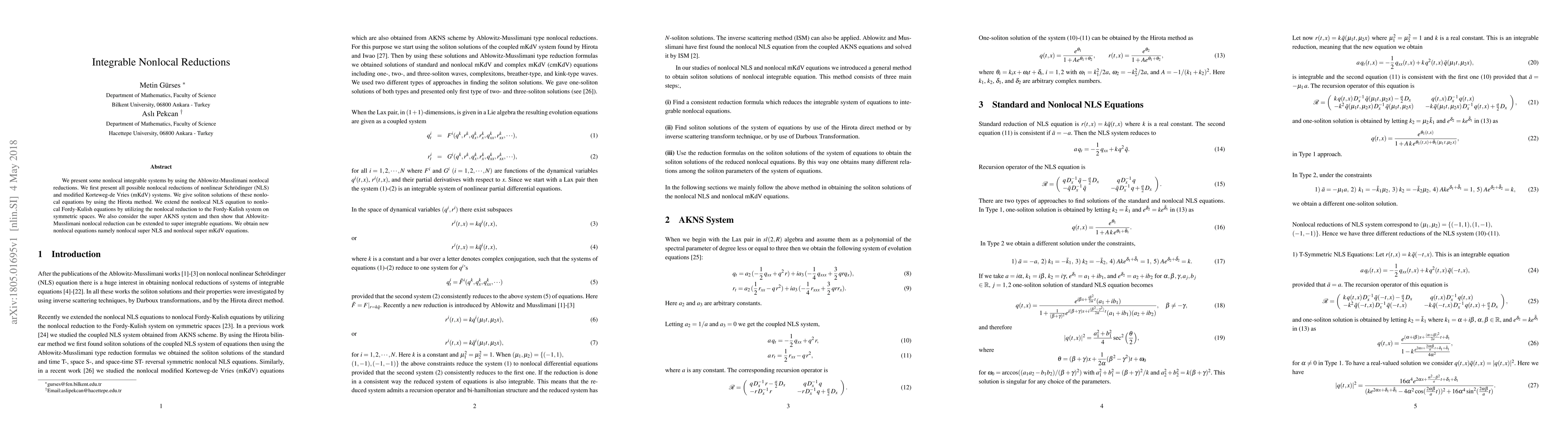 We present some nonlocal integrable systems by using the Ablowitz-Musslimani nonlocal reductions. We first present all possible nonlocal reductions of nonlinear Schr\"{o}dinger (NLS) and modified Korteweg-de Vries (mKdV) systems. We give soliton solutions of these nonlocal equations by using the Hirota method. We extend the nonlocal NLS equation to nonlocal Fordy-Kulish equations by utilizing the nonlocal reduction to the Fordy-Kulish system on symmetric spaces. We also consider the super AKNS system and then show that Ablowitz-Musslimani nonlocal reduction can be extended to super integrable equations. We obtain new nonlocal equations namely nonlocal super NLS and nonlocal super mKdV equations.