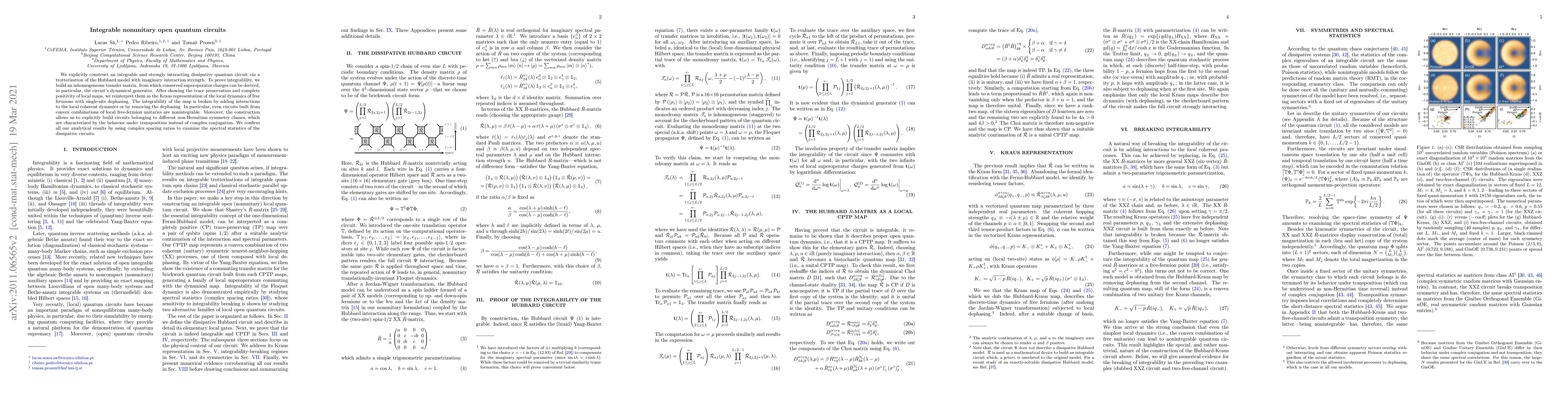 This paper constructs an integrable, strongly interacting dissipative quantum circuit via a trotterization of the Hubbard model with imaginary interaction strength, demonstrating integrability through conserved superoperator charges. The study shows that adding interactions or removing dephasing breaks integrability, and confirms analytical results through spectral statistics analysis.