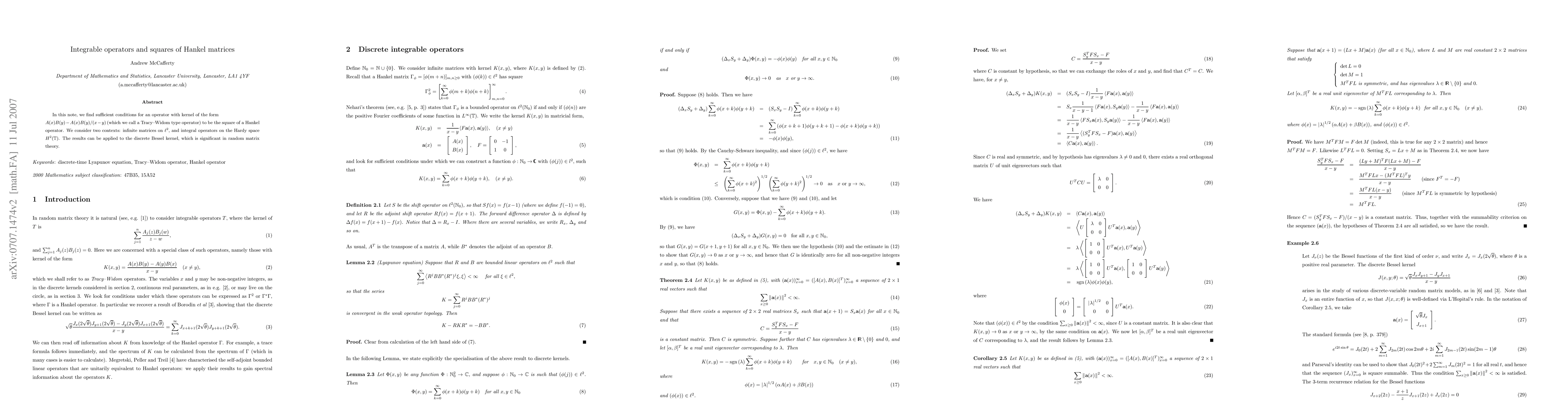 This paper identifies sufficient conditions for a Tracy-Widom type operator to be the square of a Hankel operator, considering both infinite matrices and integral operators on the Hardy space. The findings are relevant to the discrete Bessel kernel, important in random matrix theory.