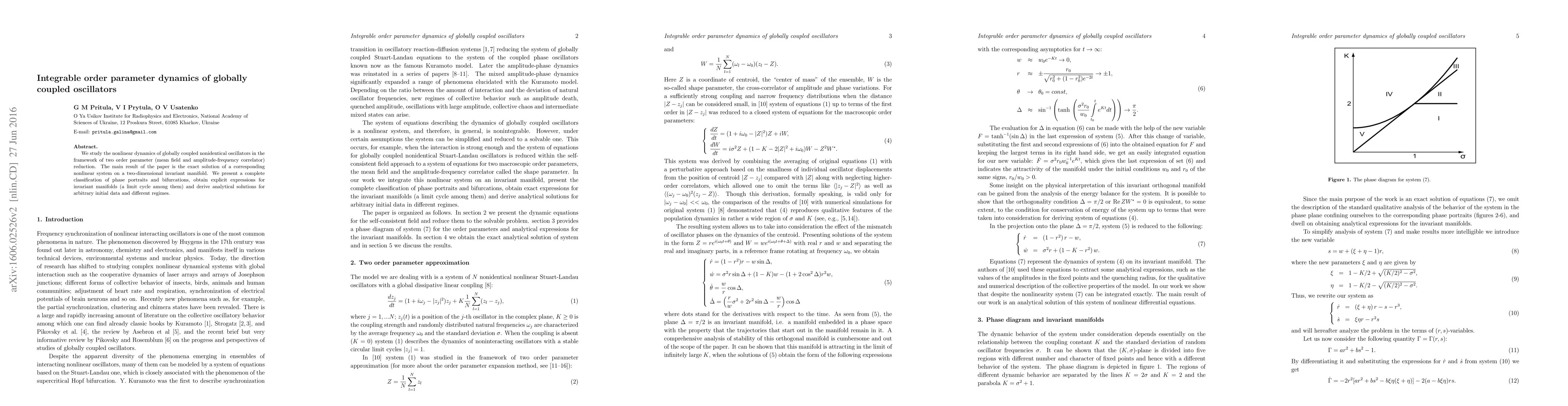 We study the nonlinear dynamics of globally coupled nonidentical oscillators in the framework of two order parameter (mean field and amplitude-frequency correlator) reduction. The main result of the paper is the exact solution of the corresponding nonlinear system on an attracting manifold. We present a complete classification of phase portraits and bifurcations, obtain explicit expressions for invariant manifolds (a limit cycle among them) and derive analytical solutions for arbitrary initial data and different regimes.