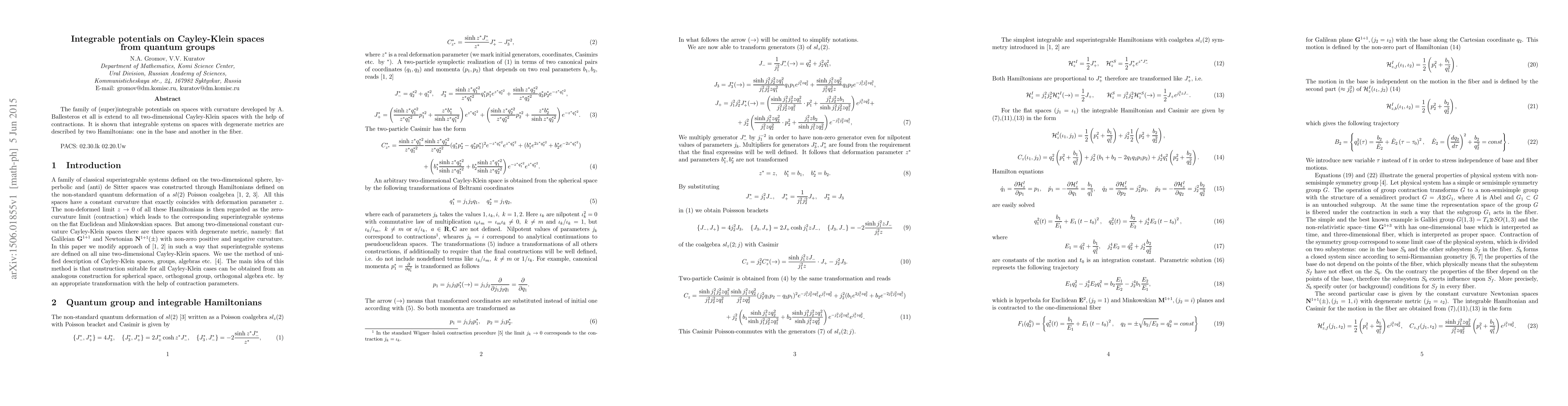 This paper extends the family of integrable potentials on curved spaces to two-dimensional Cayley-Klein spaces using quantum group contractions. It demonstrates that integrable systems on spaces with degenerate metrics are governed by two Hamiltonians, one in the base and one in the fiber.