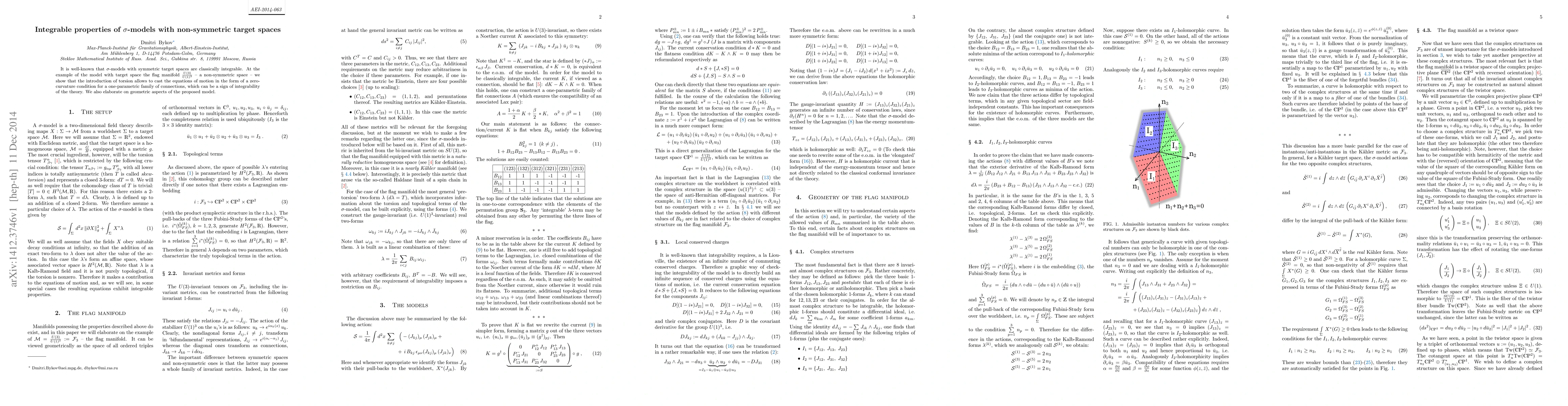 It is well-known that sigma-models with symmetric target spaces are classically integrable. At the example of the model with target space the flag manifold U(3)/U(1)^3 -- a non-symmetric space -- we show that the introduction of torsion allows to cast the equations of motion in the form of a zero-curvature condition for a one-parametric family of connections, which can be a sign of integrability of the theory. We also elaborate on geometric aspects of the proposed model.