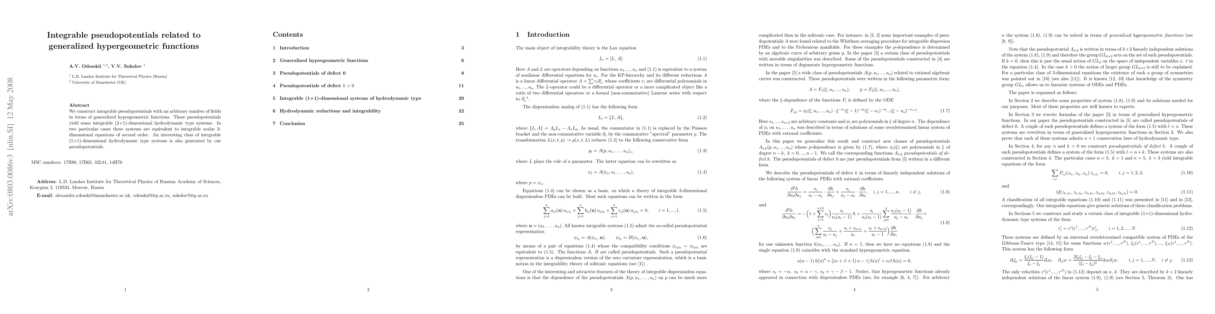 This paper constructs integrable pseudopotentials using generalized hypergeometric functions, which generate both (2+1)-dimensional hydrodynamic type systems and an interesting class of (1+1)-dimensional hydrodynamic type systems. The pseudopotentials offer a new framework for studying integrable systems.