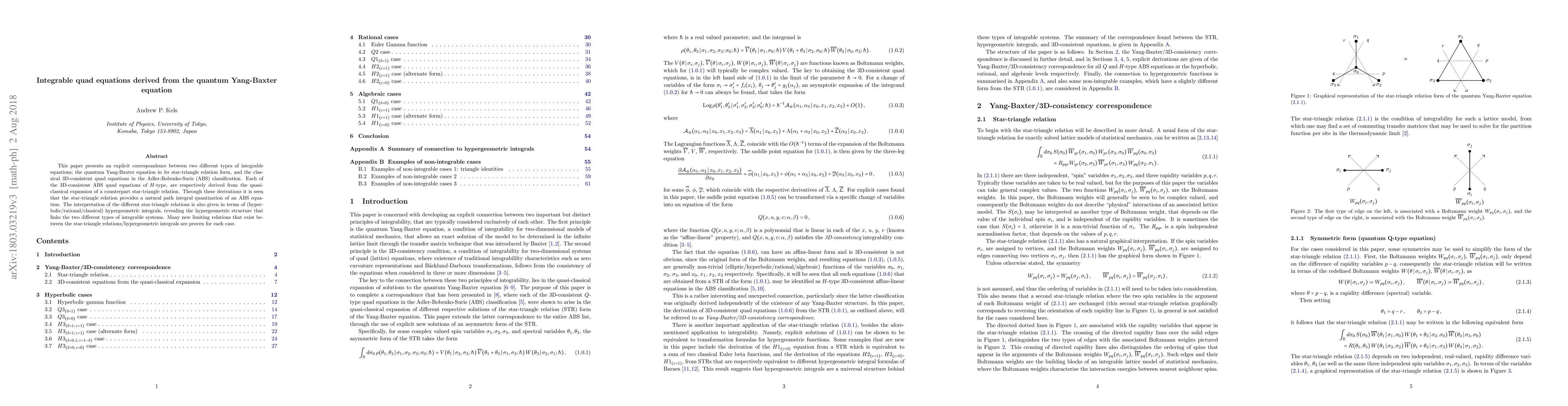 This paper establishes a direct link between quantum integrable systems defined by the quantum Yang-Baxter equation and classical integrable equations in the Adler-Bobenko-Suris classification, revealing their shared hypergeometric structure and proving new limiting relations between them.