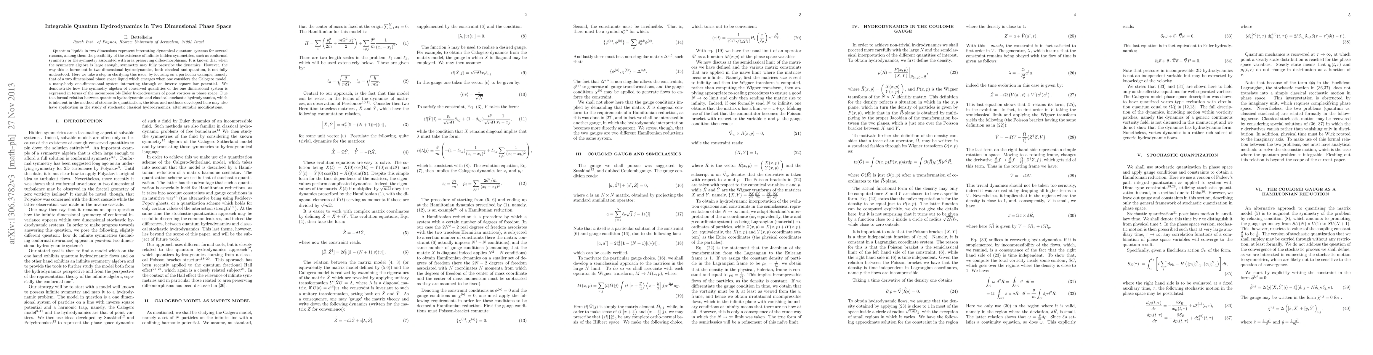 This paper explores the integrable quantum hydrodynamics in two-dimensional phase space, demonstrating how the symmetry algebra of conserved quantities in a one-dimensional Calogero model translates to incompressible Euler hydrodynamics of point vortices. The findings may also extend to classical stochastic hydrodynamics through stochastic quantization.