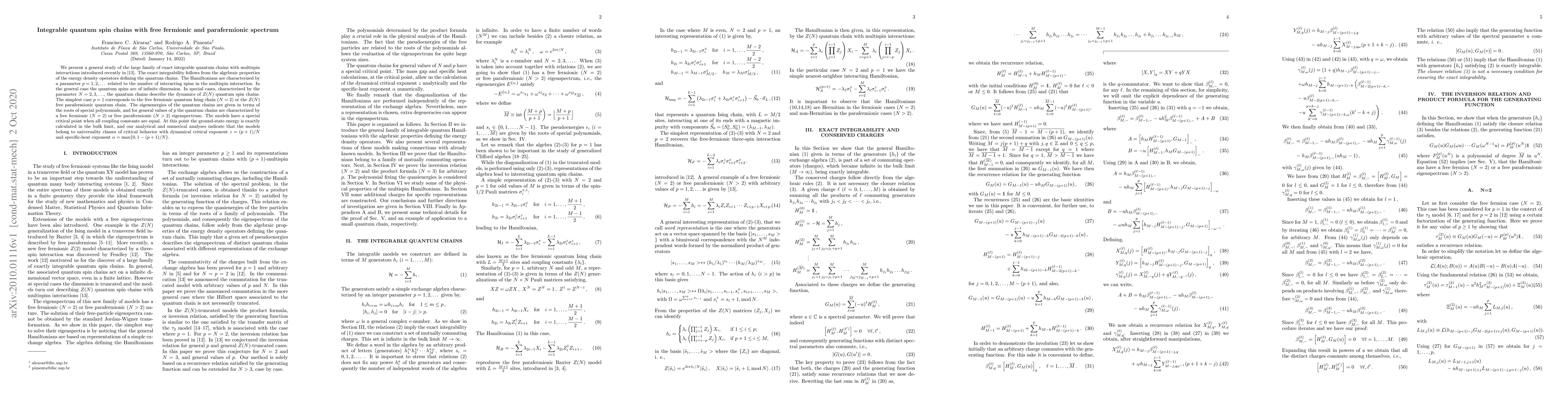 We present a general study of the large family of exact integrable quantum chains with multispin interactions introduced recently in \cite{AP2020}. The exact integrability follows from the algebraic properties of the energy density operators defining the quantum chains. The Hamiltonians are characterized by a parameter $p=1,2,\dots$ related to the number of interacting spins in the multispin interaction. In the general case the quantum spins are of infinite dimension. In special cases, characterized by the parameter $N=2,3,\ldots$, the quantum chains describe the dynamics of $Z(N)$ quantum spin chains. The simplest case $p=1$ corresponds to the free fermionic quantum Ising chain ($N=2$) or the $Z(N)$ free parafermionic quantum chain. The eigenenergies of the quantum chains are given in terms of the roots of special polynomials, and for general values of $p$ the quantum chains are characterized by a free fermionic ($N=2$) or free parafermionic ($N>2$) eigenspectrum. The models have a special critical point when all coupling constants are equal. At this point the ground-state energy is exactly calculated in the bulk limit, and our analytical and numerical analyses indicate that the models belong to universality classes of critical behavior with dynamical critical exponent $z = (p+1)/N$ and specific-heat exponent $\alpha = \max\{0,1-(p+1)/N\}$.