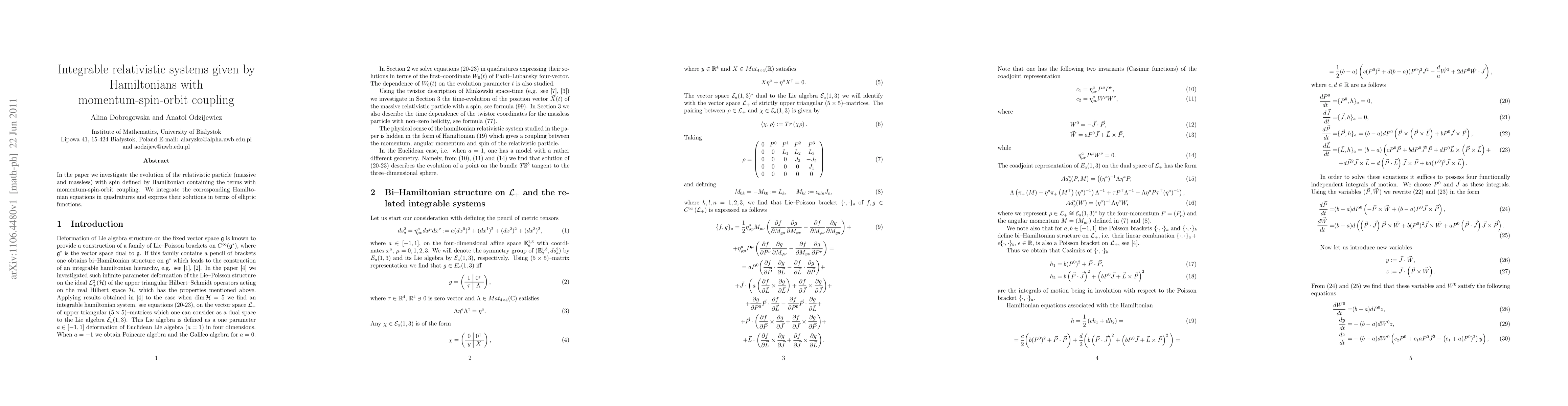 This paper explores the motion of relativistic particles (both massive and massless) with spin, integrating their Hamiltonian equations involving momentum-spin-orbit coupling terms. The solutions are expressed using elliptic functions.