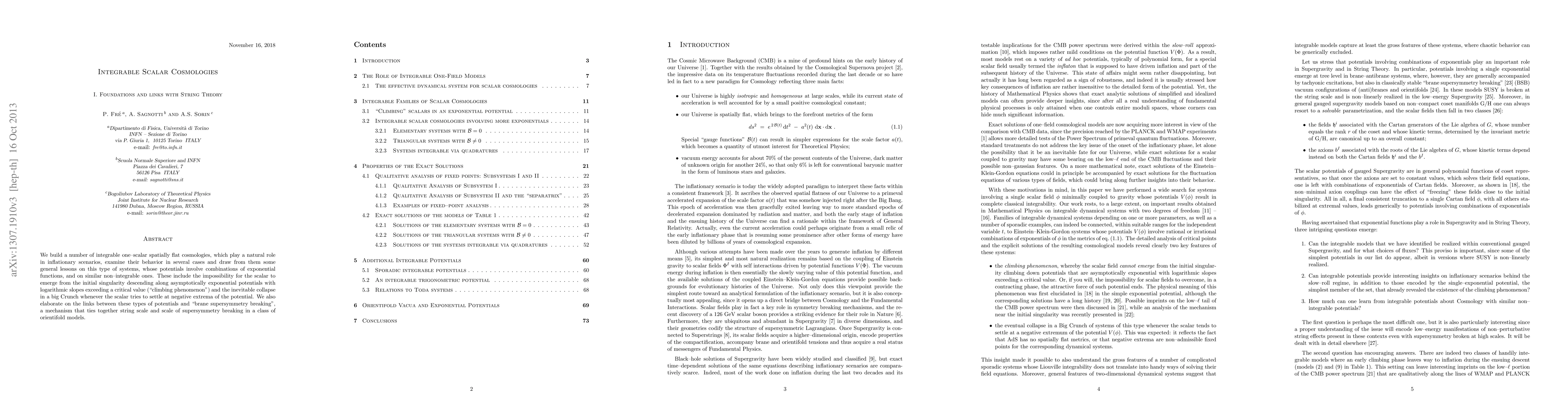 This paper constructs integrable scalar cosmologies relevant to inflationary scenarios, analyzing their behavior and drawing lessons on systems with exponential potentials. It also explores connections to brane supersymmetry breaking in string theory, showing how extended objects can induce specific inflationary phases with spectral indices tied to brane dimensions and string coupling.
