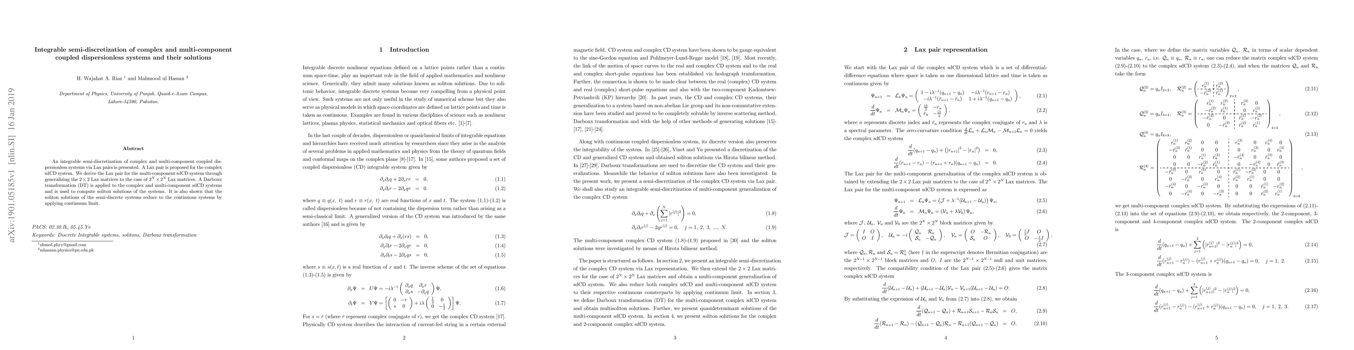 An integrable semi-discretization of complex and multi-component coupled dispersionless systems via Lax pairs is presented. A Lax pair is proposed for the complex sdCD system. We derive the Lax pair for the multi-component sdCD system through generalizing the $2 \times 2$ Lax matrices to the case of $2^{N} \times 2^{N}$ Lax matrices. A Darboux transformation (DT) is applied to the complex and multi-component sdCD systems and is used to compute soliton solutions of the systems. It is also shown that the soliton solutions of the semi-discrete systems reduce to the continuous systems by applying continuum limit.