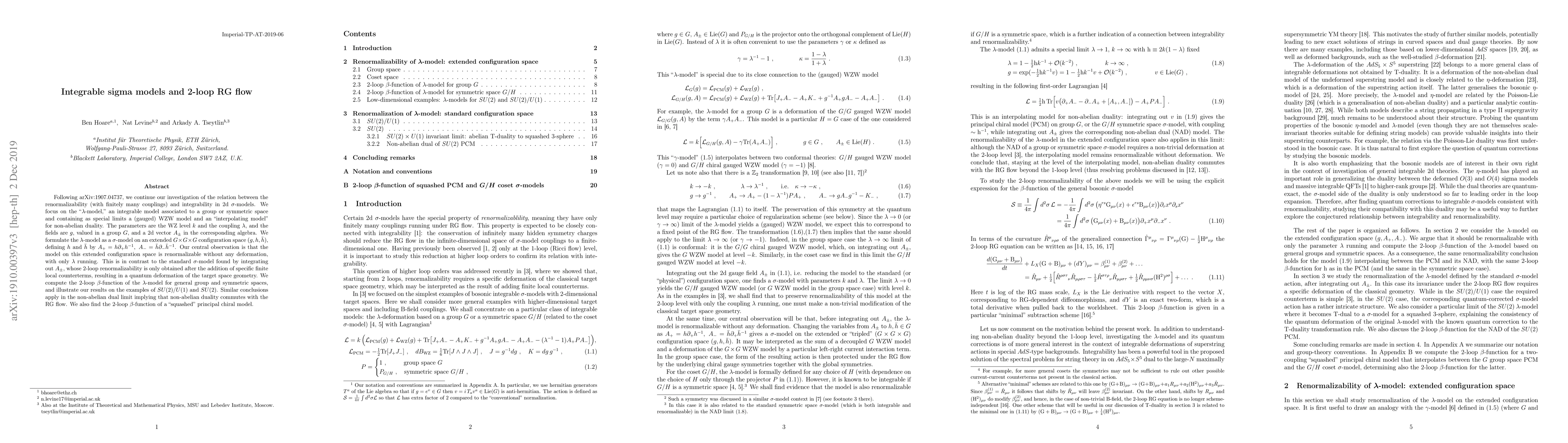 Following arXiv:1907.04737, we continue our investigation of the relation between the renormalizability (with finitely many couplings) and integrability in 2d $\sigma$-models. We focus on the "$\lambda$-model," an integrable model associated to a group or symmetric space and containing as special limits a (gauged) WZW model and an "interpolating model" for non-abelian duality. The parameters are the WZ level $k$ and the coupling $\lambda$, and the fields are $g$, valued in a group $G$, and a 2d vector $A_\pm$ in the corresponding algebra. We formulate the $\lambda$-model as a $\sigma$-model on an extended $G \times G \times G$ configuration space $(g, h, \bar{h})$, defining $h $ and $\bar{h}$ by $A_+ = h \partial_+ h^{-1}$, $A_- = \bar{h} \partial_- \bar{h}^{-1}$. Our central observation is that the model on this extended configuration space is renormalizable without any deformation, with only $\lambda$ running. This is in contrast to the standard $\sigma$-model found by integrating out $A_\pm$, whose 2-loop renormalizability is only obtained after the addition of specific finite local counterterms, resulting in a quantum deformation of the target space geometry. We compute the 2-loop $\beta$-function of the $\lambda$-model for general group and symmetric spaces, and illustrate our results on the examples of $SU(2)/U(1)$ and $SU(2)$. Similar conclusions apply in the non-abelian dual limit implying that non-abelian duality commutes with the RG flow. We also find the 2-loop $\beta$-function of a "squashed" principal chiral model.