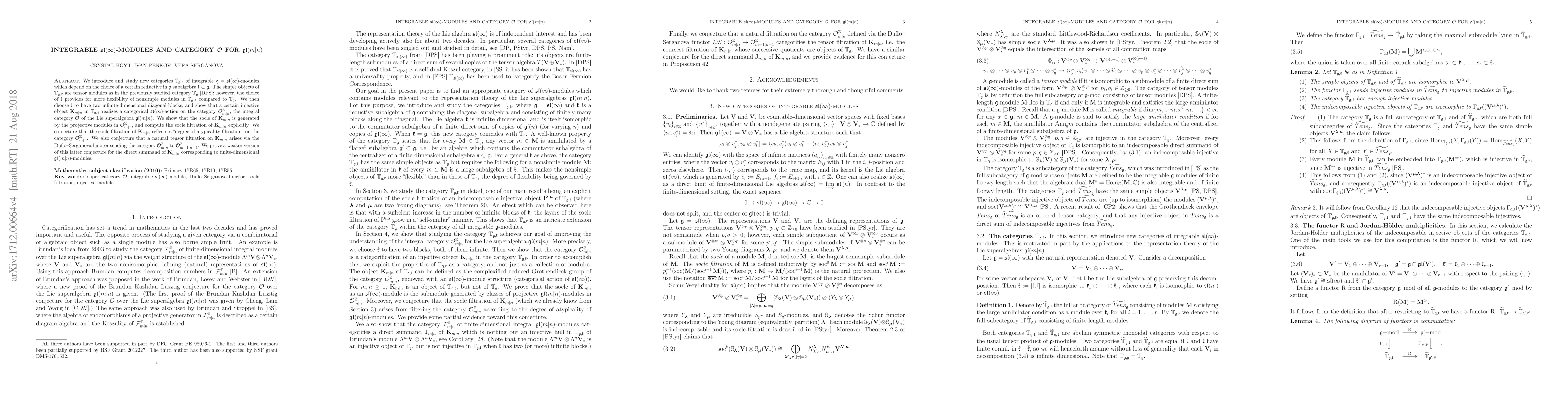 This paper introduces new categories T(g,k) of integrable sl(\infty)-modules based on reductive subalgebras k in g=sl(\infty). It demonstrates that an injective object K(m|n) in T(g,k) provides a categorical sl(\infty)-action on O(m|n) for gl(m|n), and conjectures that the socle filtration of K(m|n) mirrors the "degree of atypicality" in O(m|n). The Duflo-Serganova functor's tensor filtration on K(m|n) is proven for finite-dimensional gl(m|n)-modules.