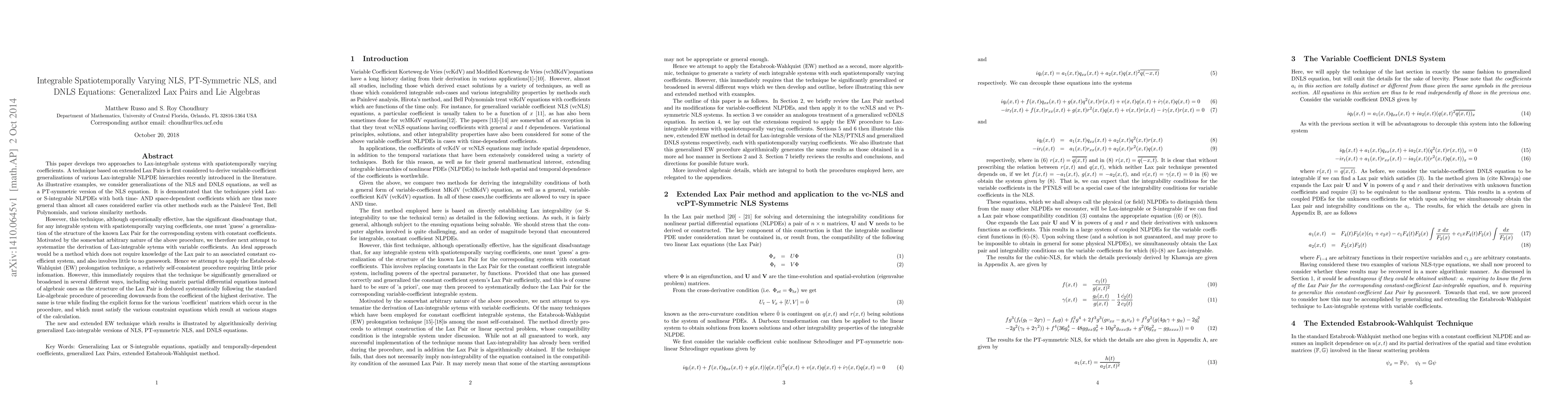 This paper explores two methods for deriving integrable nonlinear partial differential equations (NLPDEs) with spatiotemporally varying coefficients, focusing on generalized Lax pairs and Lie algebras. It introduces an extended Lax pair technique and the Estabrook-Wahlquist prolongation method to systematically generate integrable systems, exemplified by variable-coefficient versions of the NLS, PT-symmetric NLS, and DNLS equations.