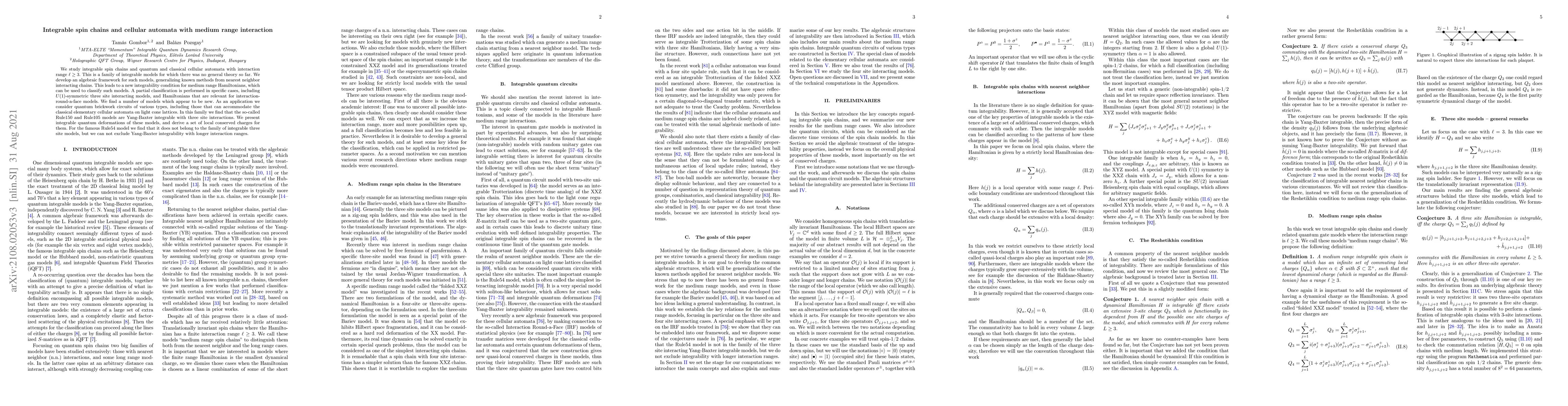 We study integrable spin chains and quantum and classical cellular automata with interaction range $\ell\ge 3$. This is a family of integrable models for which there was no general theory so far. We develop an algebraic framework for such models, generalizing known methods from nearest neighbor interacting chains. This leads to a new integrability condition for medium range Hamiltonians, which can be used to classify such models. A partial classification is performed in specific cases, including $U(1)$-symmetric three site interacting models, and Hamiltonians that are relevant for interaction-round-a-face models. We find a number of models which appear to be new. As an application we consider quantum brickwork circuits of various types, including those that can accommodate the classical elementary cellular automata on light cone lattices. In this family we find that the so-called Rule150 and Rule105 models are Yang-Baxter integrable with three site interactions. We present integrable quantum deformations of these models, and derive a set of local conserved charges for them. For the famous Rule54 model we find that it does not belong to the family of integrable three site models, but we can not exclude Yang-Baxter integrability with longer interaction ranges.