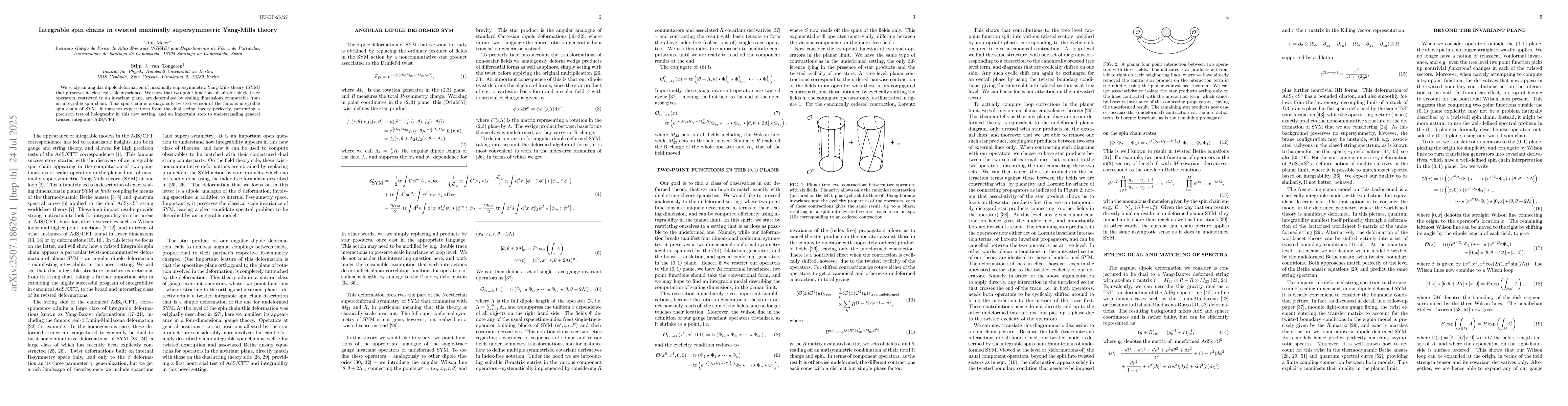 We study an angular dipole deformation of maximally supersymmetric Yang-Mills theory (SYM) that preserves its classical scale invariance. We show that two-point functions of suitable single trace operators, restricted to an invariant plane, are determined by scaling dimensions computable from an integrable spin chain. This spin chain is a diagonally twisted version of the famous integrable spin chain of SYM. It matches expectations from the dual string theory perfectly, presenting a precision test of holography in this new setting, and an important step to understanding general twisted integrable AdS/CFT.
