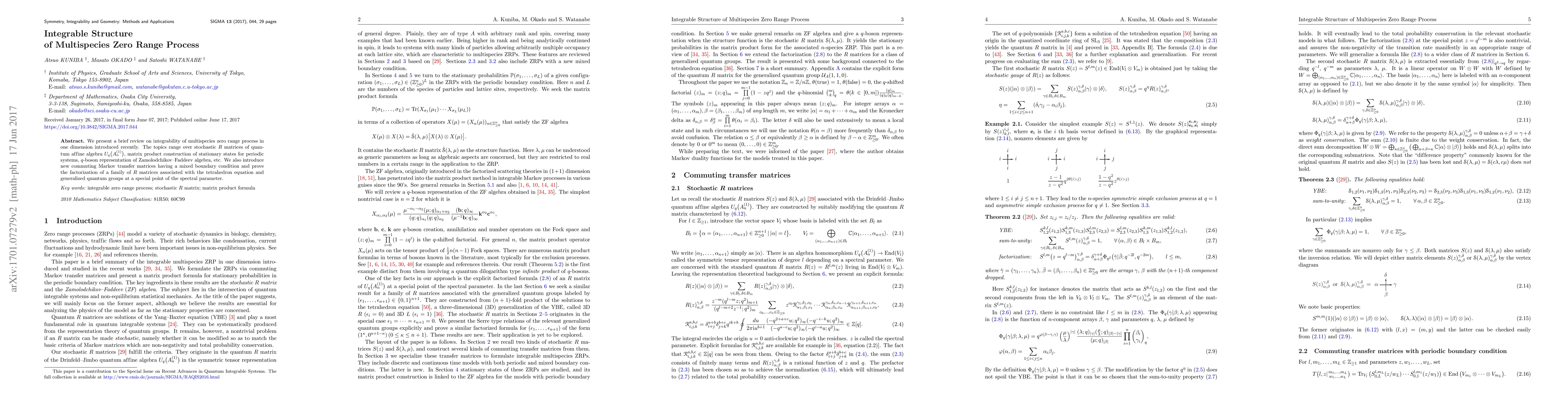 We present a brief review on integrability of multispecies zero range process in one dimension introduced recently. The topics range over stochastic $R$ matrices of quantum affine algebra $U_q (A^{(1)}_n)$, matrix product construction of stationary states for periodic systems, $q$-boson representation of Zamolodchikov-Faddeev algebra, etc. We also introduce new commuting Markov transfer matrices having a mixed boundary condition and prove the factorization of a family of $R$ matrices associated with the tetrahedron equation and generalized quantum groups at a special point of the spectral parameter.