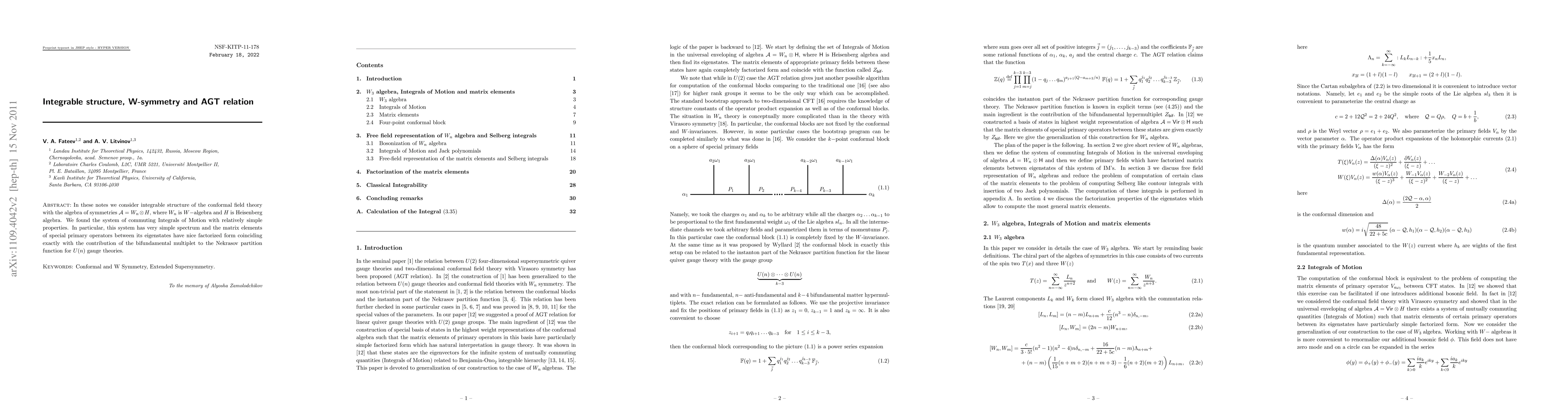 In these notes we consider integrable structure of the conformal field theory with the algebra of symmetries $\mathcal{A}=W_{n}\otimes H$, where $W_{n}$ is $W-$algebra and $H$ is Heisenberg algebra. We found the system of commuting Integrals of Motion with relatively simple properties. In particular, this system has very simple spectrum and the matrix elements of special primary operators between its eigenstates have nice factorized form coinciding exactly with the contribution of the bifundamental multiplet to the Nekrasov partition function for U(n) gauge theories.