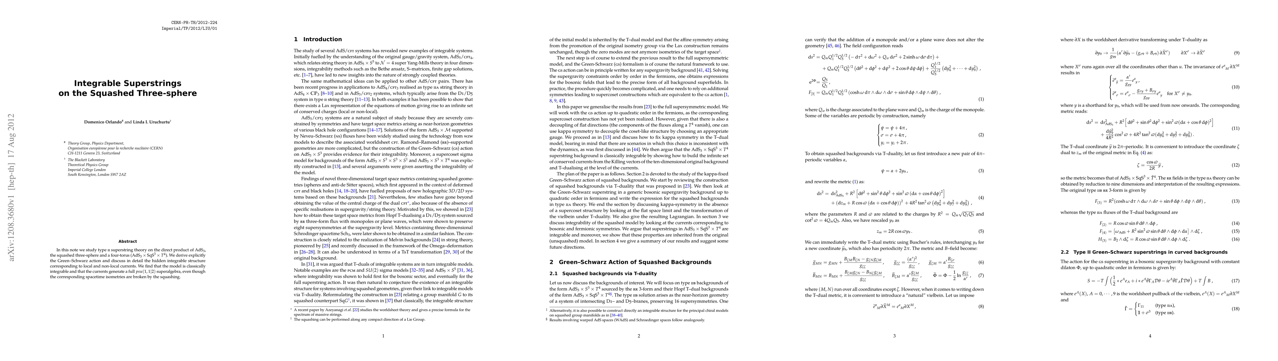 This paper explores type II superstring theory on a squashed three-sphere within AdS3, revealing an integrable structure through the Green-Schwarz action. The model is shown to be classically integrable, with currents generating a psu(1, 1|2) superalgebra despite broken spacetime isometries.