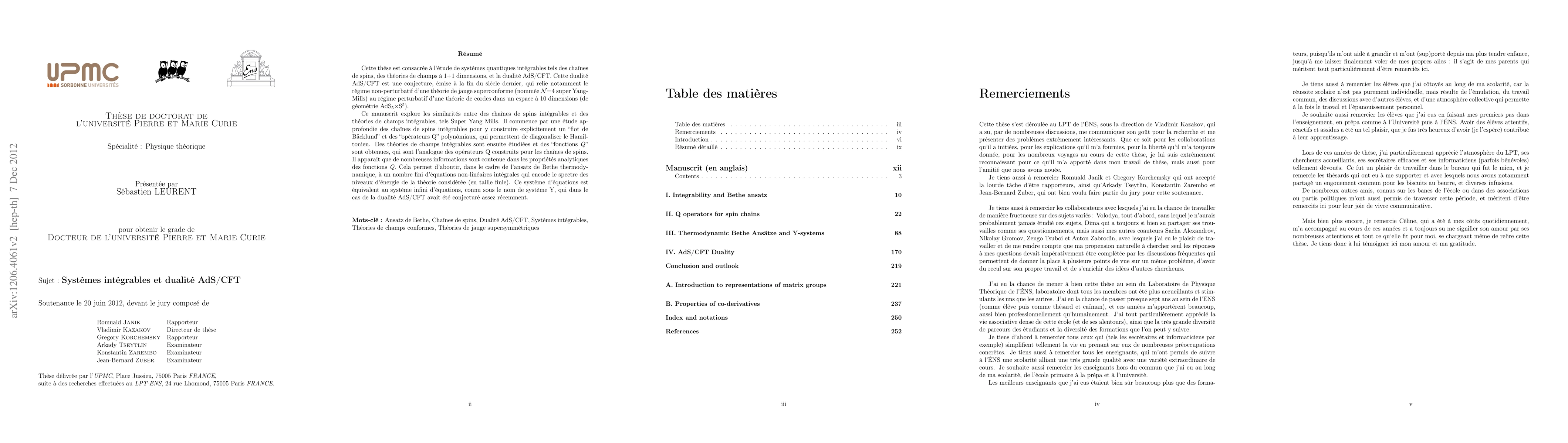 This PhD thesis investigates the connection between integrable spin chains and quantum field theories, constructing polynomial "Backlund flows" and "Q-operators" for spin chains and "Q-functions" for field theories. The study reveals that the analytic properties of these functions encode crucial information, leading to a finite set of non-linear integral equations equivalent to the Y-system, which is central to the AdS/CFT duality.