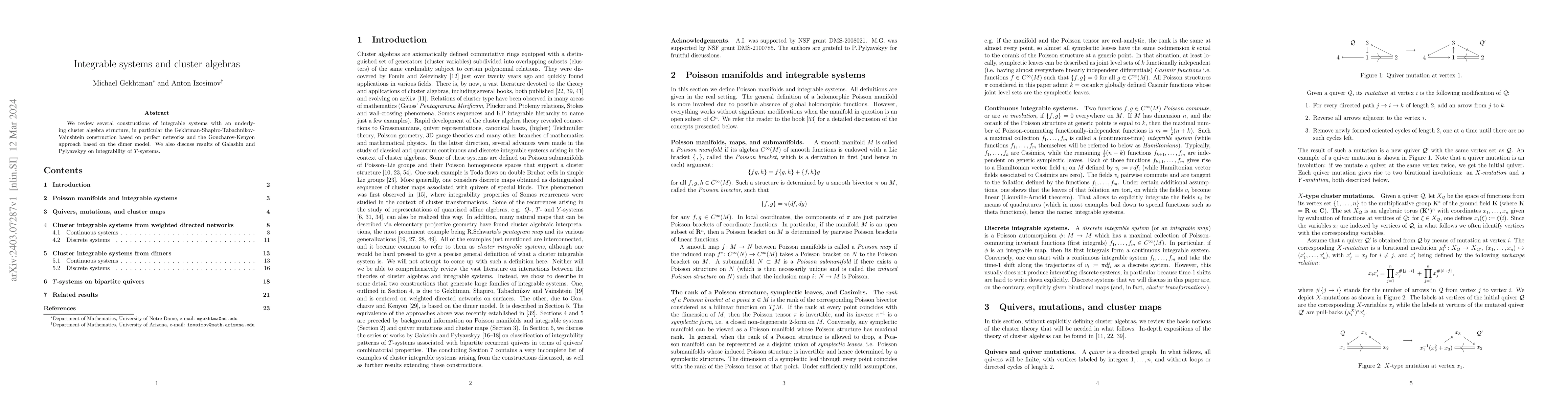 This paper reviews integrable systems linked to cluster algebras, focusing on the Gekhtman-Shapiro-Tabachnikov-Vainshtein construction using perfect networks and Goncharov-Kenyon's dimer model approach, along with results on T-systems' integrability by Galashin and Pylyavskyy.