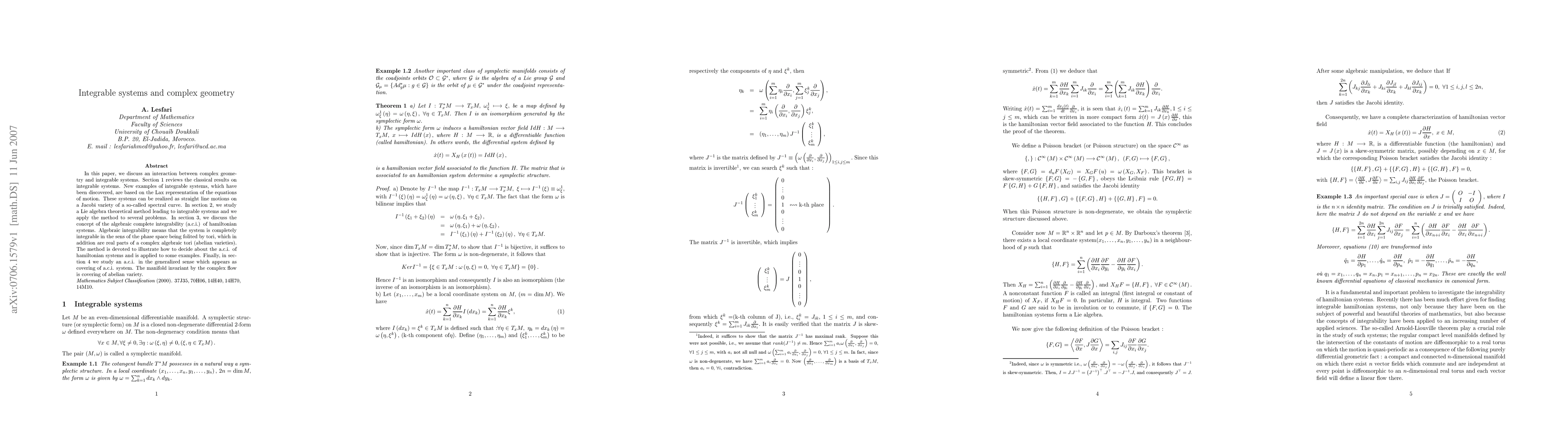 This paper explores the interplay between complex geometry and integrable systems, introducing new examples based on Lax representations and Jacobi varieties. It also delves into Lie algebra methods for constructing integrable systems and discusses algebraic complete integrability, applying these concepts to various examples.