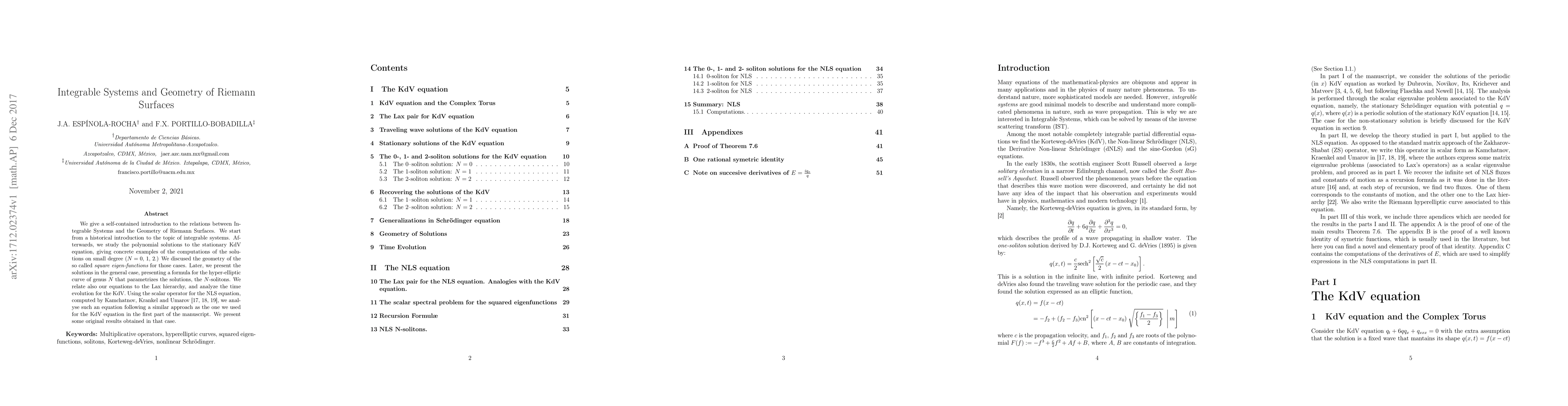 We give a self-contained introduction to the relations between Integrable Systems and the Geometry of Riemann Surfaces. We start from a historical introduction to the topic of integrable systems. Afterwards, we study the polynomial solutions to the stationary KdV equation, giving concrete examples of the computations of the solutions on small degree ($N=0$, $1$, $2$.) We discused the geometry of the so called "square eigen-functions" for those cases. Later, we present the solutions in the general case, presenting a formula for the hyper-elliptic curve of genus $N$ that parametrizes the solutions, the $N$-solitons. We relate also our equations to the Lax hierarchy, and analyze the time evolution for the KdV. Using the scalar operator for the NLS equation, computed by Kamchatnov, Krankel and Umarov, we analyse such an equation, following a similar approach as the one we used for the KdV equation. We present some original results obtained in that case.
